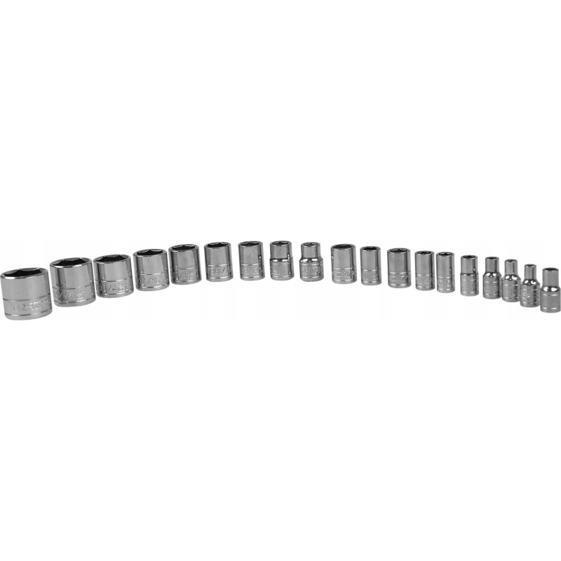 W skład zestawu wchodzi bogaty wybór nasadek, zarówno metrycznych, jak i calowych. Oferowane nasadki 6-kątne w różnych rozmiarach umożliwiają pracę z różnorodnymi śrubami i nakrętkami, co czyni zestaw niezwykle wszechstronnym.