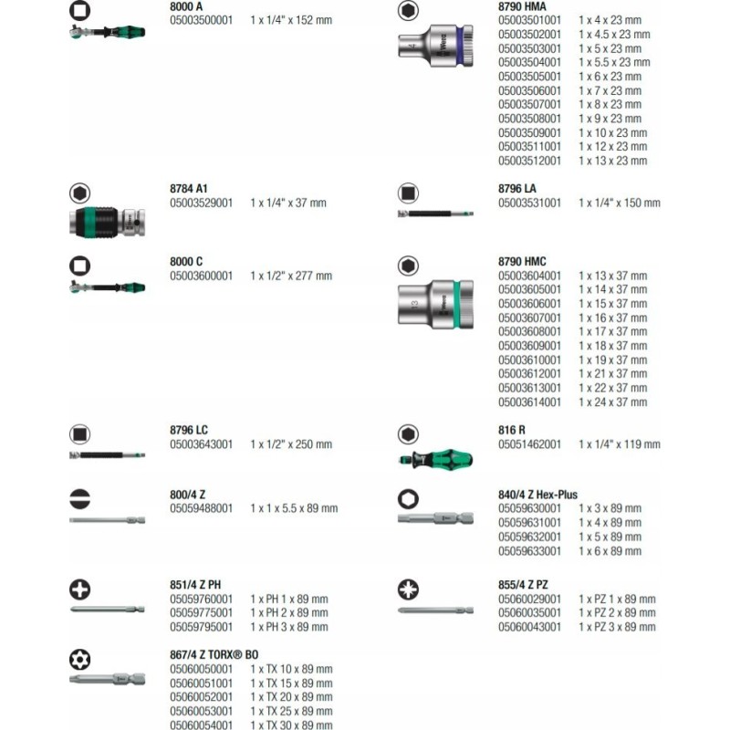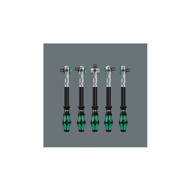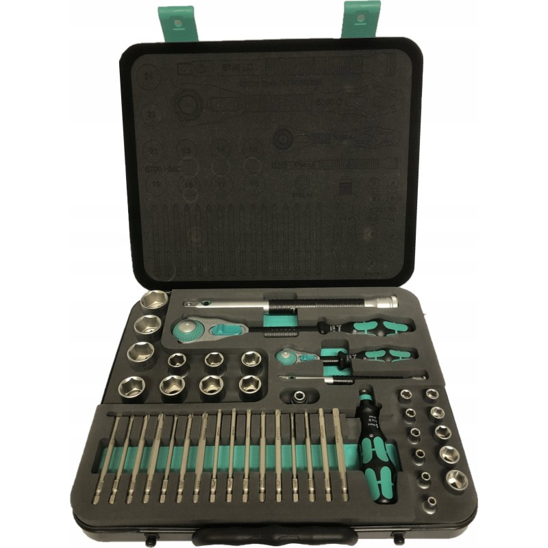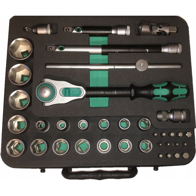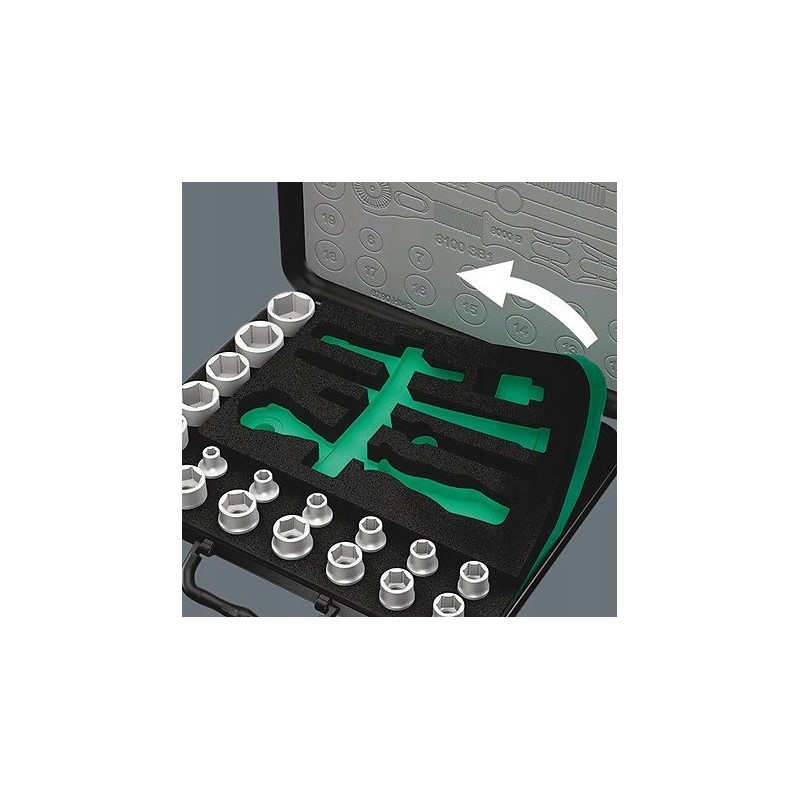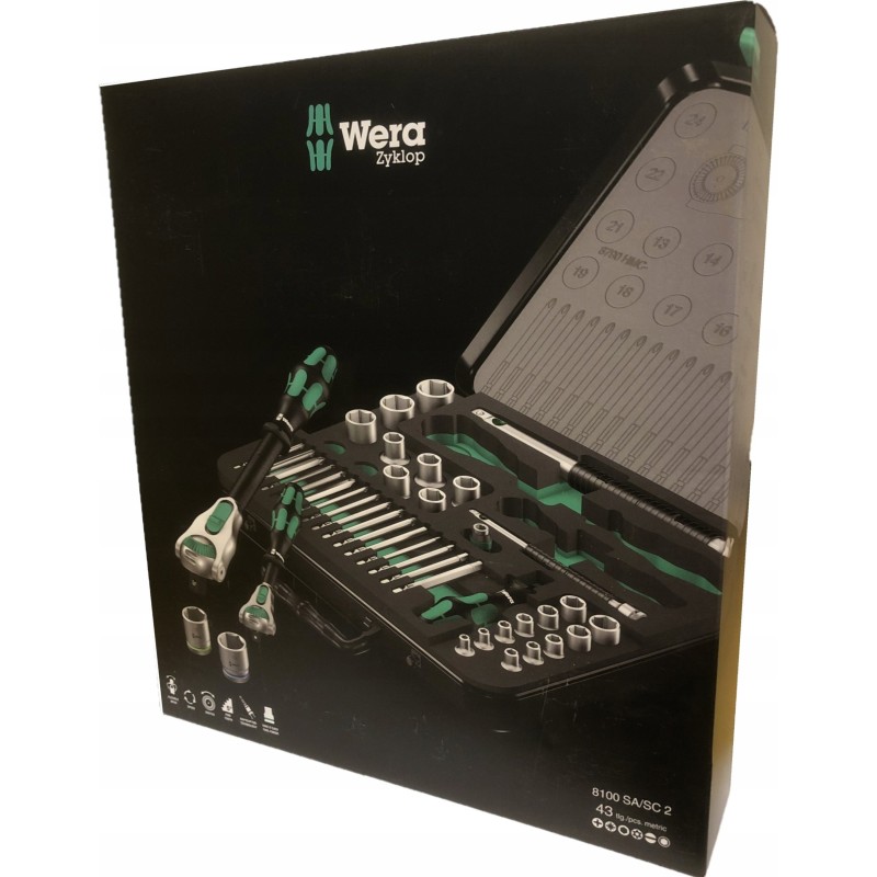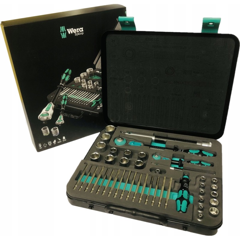 43-częściowy zestaw Zyklop w wytrzymałej metalowej obudowie: 1 szybka grzechotka Zyklop z przemiennikiem 1/4", 1 szybka grzechotka Zyklop z przemiennikiem 1/2". Precyzyjny podział z 72 zębami zapewnia niewielki kąt obrotu wynoszący 5°. Grzechotka ma ruchomą głowicę, którą można zablokować w każdej pozycji dzięki dwustronnemu przełącznikowi blokady. Zapewnia to wygodną pracę nawet w bardzo ciasnych lub trudno dostępnych miejscach, dając wystarczającą przestrzeń dla ruchu dłoni. Blokowanie głowicy w pozycjach 0°, 15° i 90° w prawo i lewo zapewnia bezpieczne użytkowanie, eliminując ryzyko zsunięcia się głowicy grzechotki. W pozycji 0°, przy użyciu adaptera i końcówek, może być używana jak zwykły wkrętak. Konstrukcja wykorzystująca masę narzędzia pozwala na szybszy montaż. Symetryczna rękojeść z tuleją obrotową Kraftform umożliwia szybkie obracanie. Kształt rękojeści Kraftform doskonale dopasowuje się do dłoni, chroniąc ją przed obtarciami i odciskami. Twarde elementy materiału rękojeści pozwalają na płynne obracanie bez ryzyka przesuwania się dłoni po rękojeści. Miękkie, antypoślizgowe strefy umożliwiają przenoszenie dużych sił bez utraty przyczepności. Dołączone gniazda narzędziowe i przemienniki o gnieździe przemiennym 1/4" z mechanizmem blokującym. 21 gniazd narzędziowych Zyklop, 2 przedłużacze Zyklop z ruchomą tuleją, 1 rękojeść Kraftform z uchwytem do końcówek i grotów oraz szybkozłączem; 16 końcówek. Narzędzia Wera z funkcją „Take it easy": system kolorowego oznaczania gniazd zgodnie z rozmiarami.