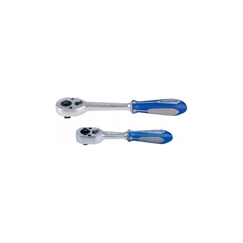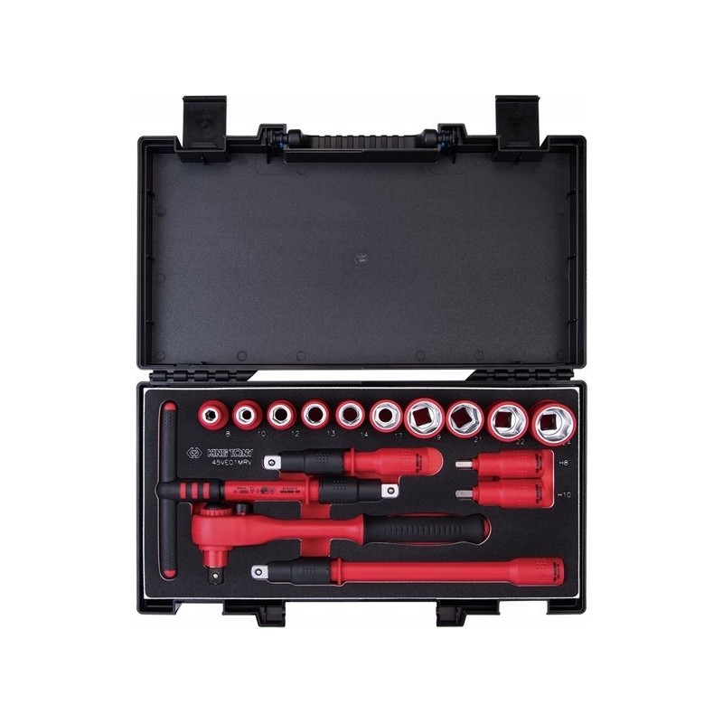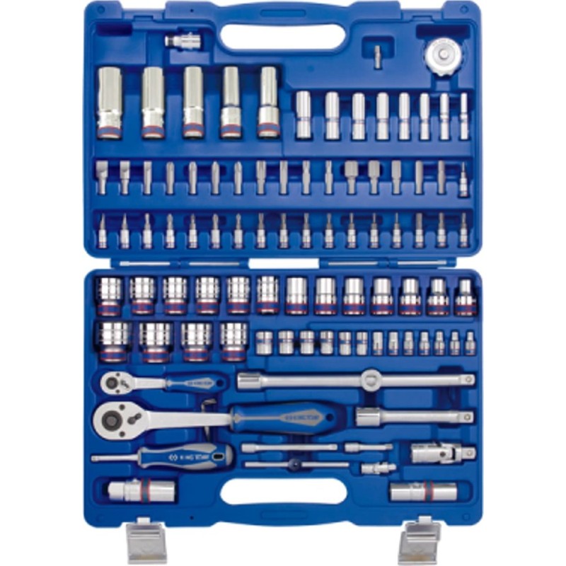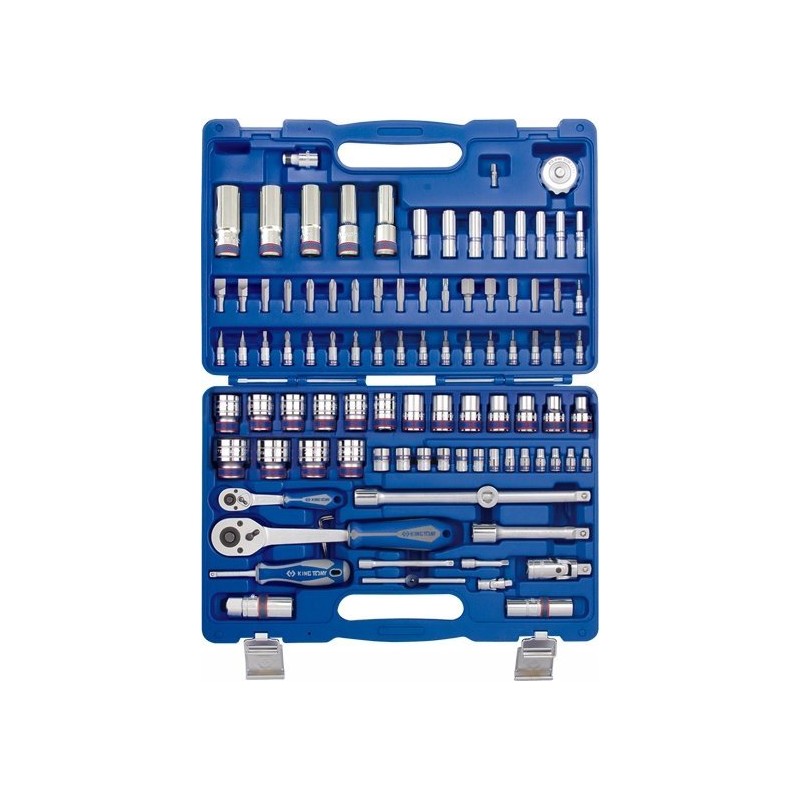Nasadki KING TONY wyróżniają się wysoką jakością wykonania i precyzją wymiarową. Patentowany, kolorowy pasek na kluczach nasadowych ułatwia odróżnienie kluczy metrycznych od calowych. Profesjonalny zestaw narzędziowy 96-elementowy z metrycznymi kluczami nasadowymi i akcesoriami, przeznaczony do użytku w przemyśle, serwisach i warsztatach samochodowych. Nasadki wykonane są z wysokiej jakości stali chromowo-wanadowej CrV, która została poddana procesowi chromowania i polerowania. Cztery rowki wewnątrz nasadki zapobiegają przypadkowemu zsunięciu się klucza z pokrętła. Grzechotka wykonana jest ze stali chromowo-wanadowej CrV, a elementy zapadkowe wewnątrz pokrętła są zrobione ze stali chromowo-molibdenowej CrMo. Grzechotka posiada rękojeść z tworzywa sztucznego, przycisk zwalniający nasadki oraz przełącznik kierunku obrotu (prawo/lewo). Wszystko to zmieszczono w wytrzymałym plastikowym walizce z metalowymi zapięciami, ułatwiającej przechowywanie i transport zestawu narzędziowego.