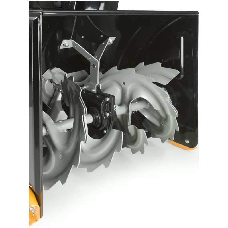 Specjalnie zaprojektowany system frezu ślimakowego o szerokości roboczej aż 56 cm wbija śnieg do obudowy, a następnie wyrzuca go przez komin wylotowy na odległość do 10 m. Frez wykonany został ze wzmocnionej, wytrzymałej stali - śnieg i lód są rozdrabniane przez ostrza świdra, zanim zostaną wprowadzone do wirnika. Tak zaprojektowany 2-stopniowy zespół roboczy jest idealny i w pełni bezpieczny dla powierzchni betonowych takich jak chodniki, ścieżki z kostki brukowej i nie tylko. Solidny podajnik ślimakowy umożliwia pracę zarówno przy zmrożonym, jak i bardzo mokrym śniegu.
