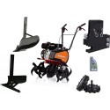 Typ silnika: spalinowy, czterosuwowy, górnozaworowy. Producent silnika: LONCIN. Model silnika: G200F. Pojemność silnika: 196 cm3. Maksymalna moc silnika: 6,5 KM. Maksymalna szerokość robocza: 84 cm. Maksymalna głębokość robocza: 33 cm. Ilość gwiazd roboczych: 6 (3+3). Ilość noży pielących: 24. Bieg do przodu: tak. Bieg wsteczny: tak. Tarcze boczne chroniące rośliny: nie. Ilość kół podporowych: 2 z tyłu. Akcesoria opcjonalne: koła gumowe, metalowe, konsola, pług, obsypnik, wyorywacz, lemiesz, skaryfikator, tarcze boczne.