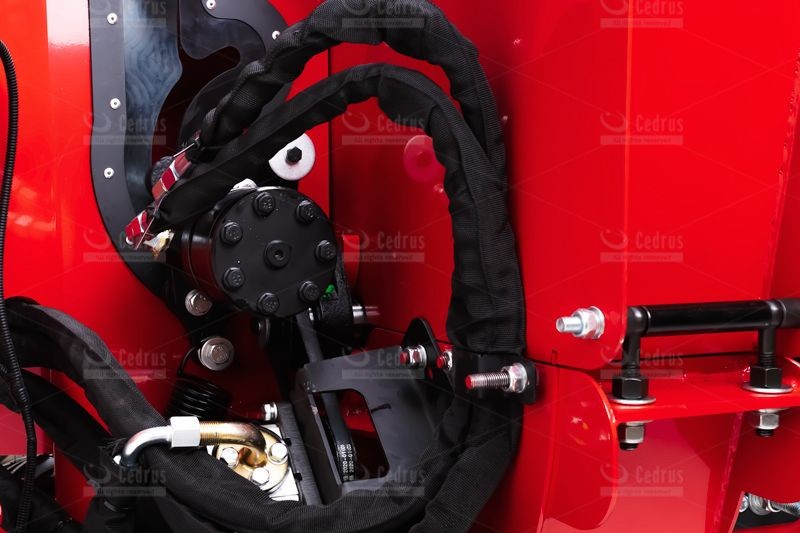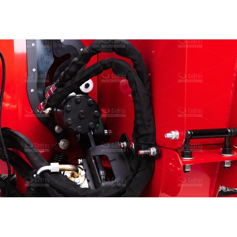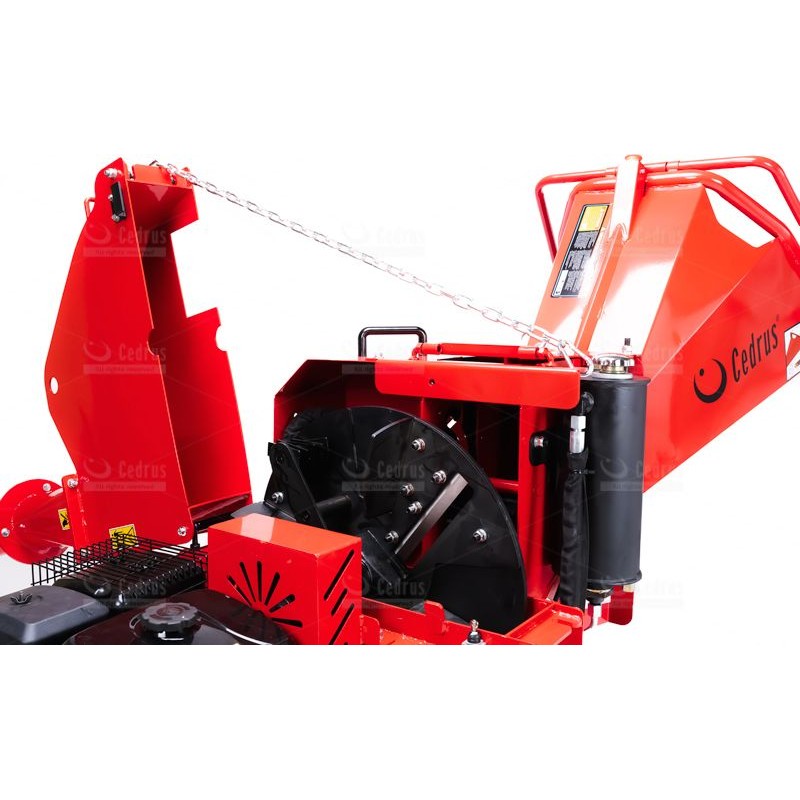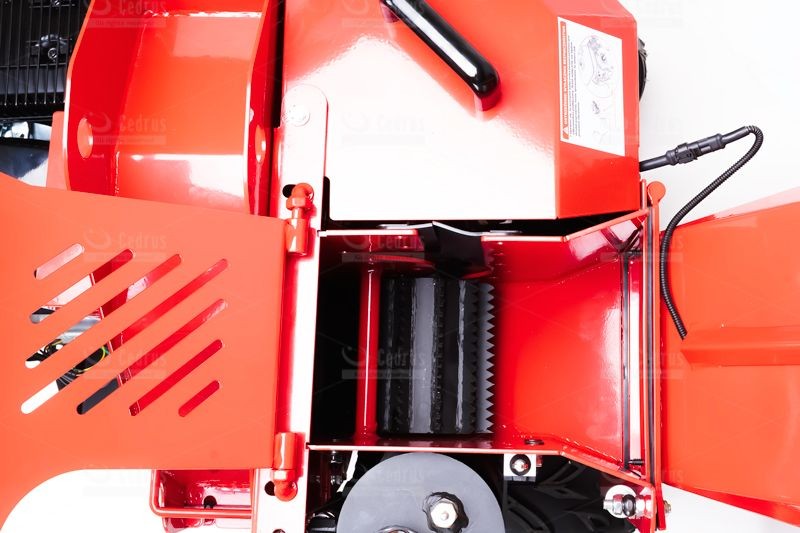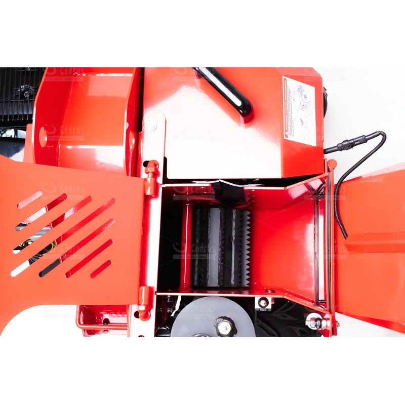 CEDRUS RB05PRO-HE jest to maszyna z hydraulicznym podajnikiem gałęzi. Za podawanie gałęzi odpowiada walec z zębami napędzany za pomocą pompy hydraulicznej. Za pomocą dźwigni możesz zmieniać kierunek obrotu tego walca lub go zatrzymać czyli możesz cofnąć gałąź od noży. Prędkość podawania czyli obrotu tego walca też jest regulowana. To rozwiązanie jest szczególnie przydatne przy rozgałęzionych konarach, gałęziach z kolcami, cierniami itd. Układ tnący to nie tylko dwa stałe noże na tarczy, ale także noże rozdrabniające jest ich 10 szt. Gałęzie podawane są na 2 ostrza (oraz nóż kontrujący), które wstępnie tną materiał. Następnie ścinki trafiają na system 10 ostrzy na tarczy tnącej, które rozdrabniają materiał do zadanej wielkości. Układ hydrauliczny ma pojemność 4l. Silnik Loncin G420F z rozruchem na kluczyk.
