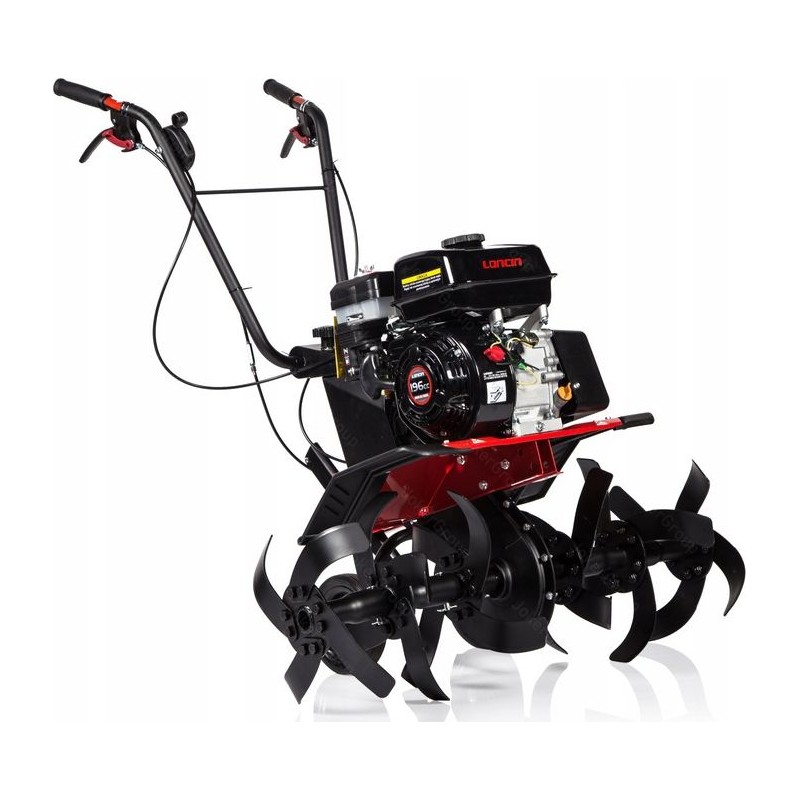 Typ silnika: spalinowy, czterosuwowy, górnozaworowy. Producent silnika: LONCIN. Model silnika: G200F. Pojemność silnika: 196 cm3. Maksymalna moc silnika: 6,5 KM. Maksymalna szerokość robocza: 84 cm. Maksymalna głębokość robocza: 33 cm. Ilość gwiazd roboczych: 6 (3+3). Ilość noży pielących: 24. Bieg do przodu: tak. Bieg wsteczny: tak. Tarcze boczne chroniące rośliny: nie. Ilość kół podporowych: 2 z tyłu. Zestaw zawiera: koła gumowe, konsolę (zaczep), wyorywacz, obsypnik, olej silnikowy.