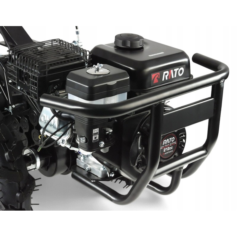 Korpus glebogryzarki wykonany jest z żeliwa, co zapewnia trwałość i solidność. Dodatkowo, system regulacji wysokości rękojeści oraz zderzak przedni chronią silnik przed uszkodzeniami, co zwiększa komfort i bezpieczeństwo pracy.