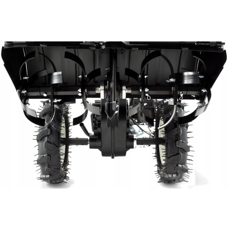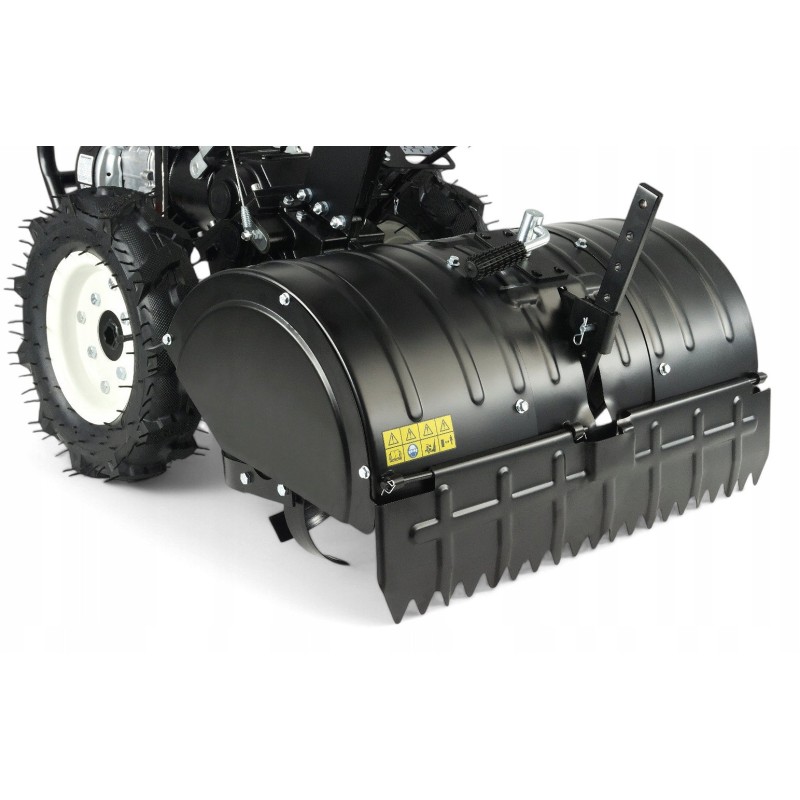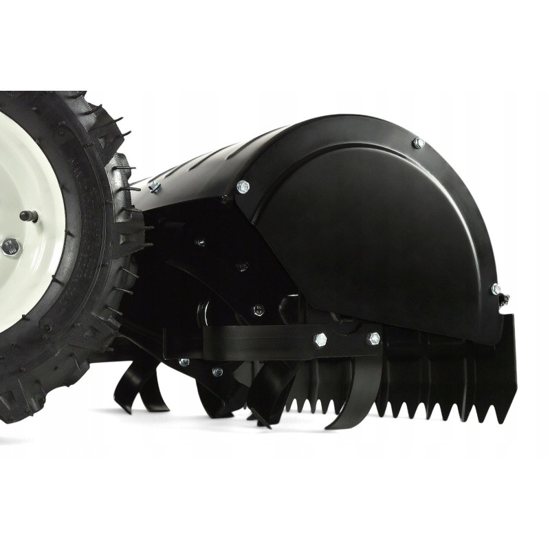 W zestawie z glebogryzarką znajdują się wszystkie niezbędne akcesoria, takie jak piasty kół, gwiazdy robocze, osłony boczne oraz manetka prędkości obrotowej silnika. Dzięki temu użytkownik ma wszystko, co potrzebne do efektywnej pracy od razu po zakupie.