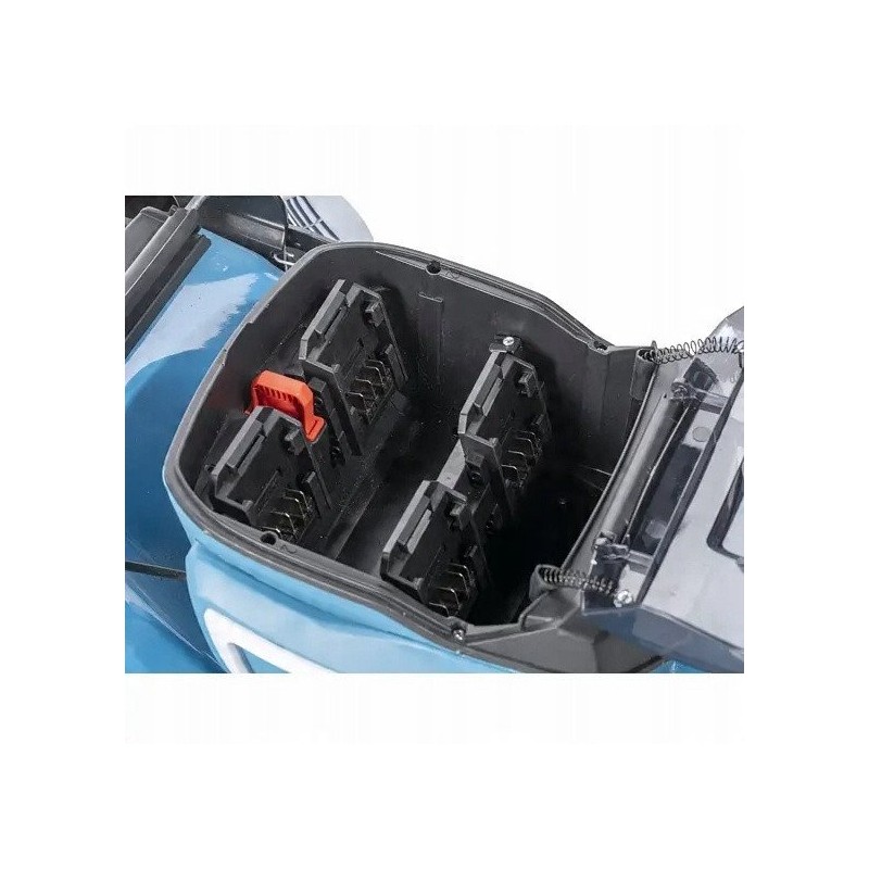 Kosiarka została wyposażona w slot na cztery akumulatory, co pozwala na długotrwałe koszenie bez potrzeby przerw na ładowanie. System automatycznego przełączania między parami akumulatorów umożliwia nieprzerwaną pracę – gdy jedna para się rozładowuje, urządzenie automatycznie przełącza się na kolejną, co zwiększa efektywność i komfort użytkowania.