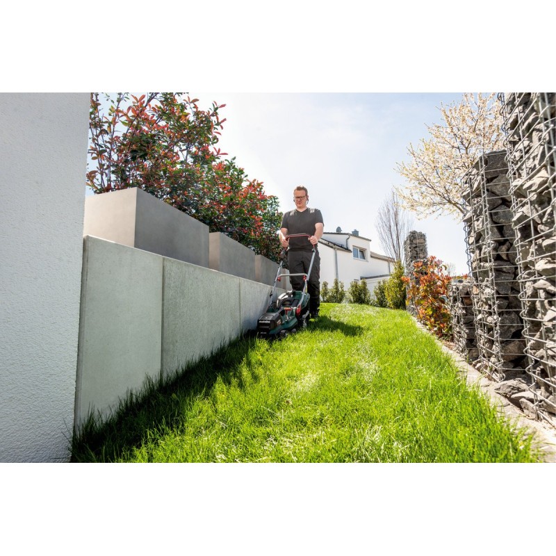 Łatwe manewrowanie dzięki lekkiej obudowie z tworzywa sztucznego. Łatwy transport i ergonomiczne przechowywanie dzięki uchwytom transportowym i podwójnie składanemu uchwytowi z systemem szybkiego blokowania. Worek na pokos z okienkiem do kontroli poziomu napełnienia. Ekologiczne i ciche zasilanie akumulatorowe umożliwia zastosowania w miejscach wymagających zachowania ciszy. 100% kompatybilności z klasą 18 V: efektywna praca 36 V dzięki zastosowaniu dwóch akumulatorów Metabo 18 V