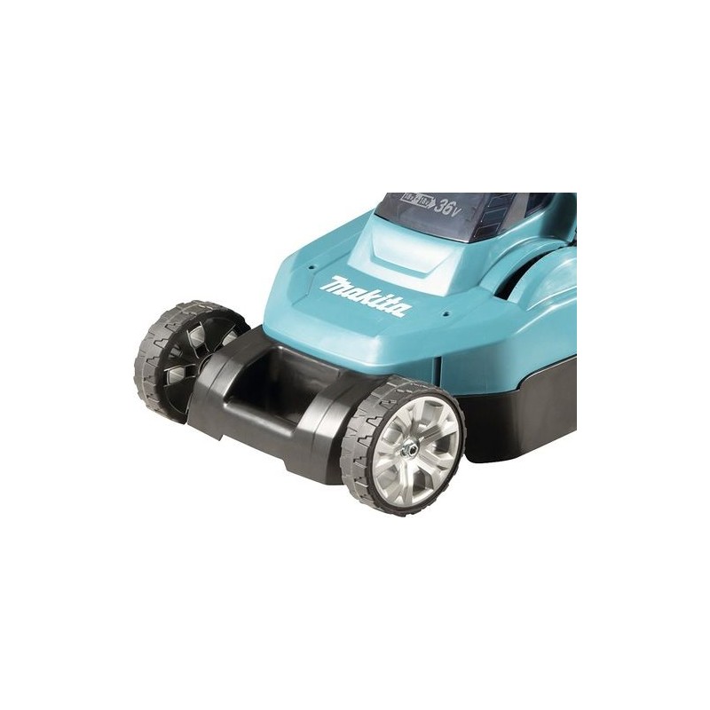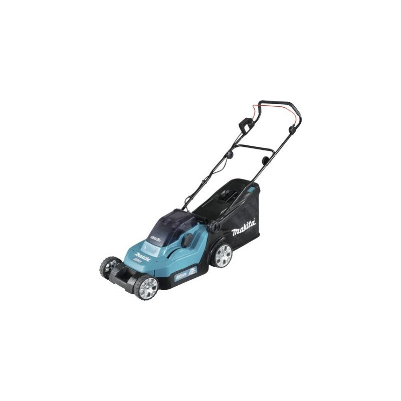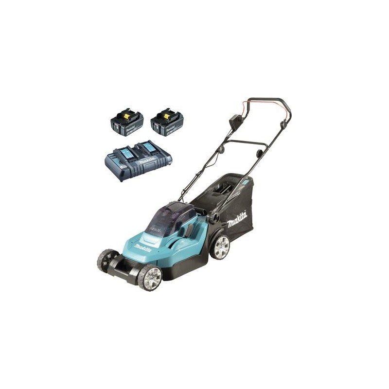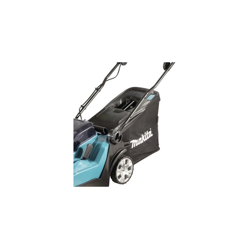 Kosiarka Makita DLM382CM2 w zestawie z 2 akumulatorami litowo-jonowymi 2 x 18 V (4,0 Ah), odporny na kurz i zachlapania, składany uchwyt do przechowywania, który zajmuje mało miejsca, kółka z łożyskami kulkowymi oraz opcjonalną funkcją mulczowania (zestaw nie zawiera zaślepki do mulczowania).