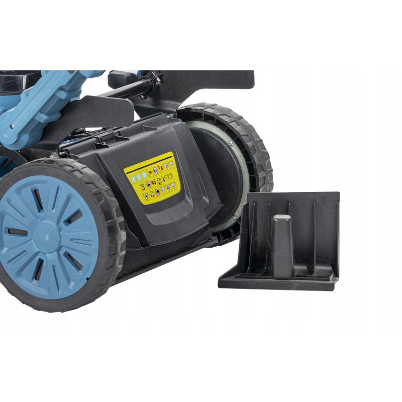 Kosiarka zasilana jest dwoma akumulatorami 18V z linii SAS+ALL, co umożliwia długotrwałe koszenie bez emisji spalin. W zestawie znajdują się akumulatory o pojemności 5 Ah oraz podwójna ładowarka, co pozwala na nieprzerwaną pracę dzięki automatycznemu przełączaniu między parami akumulatorów.