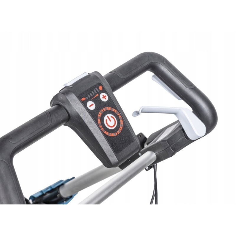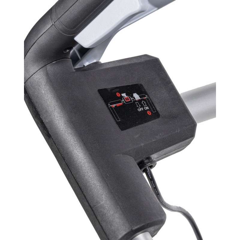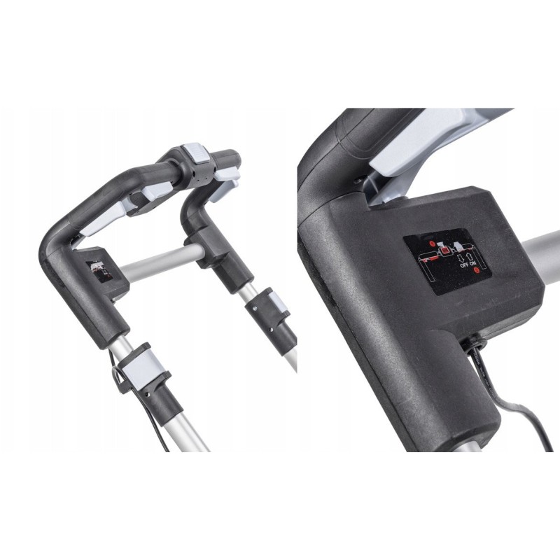 Kosiarka została wyposażona w teleskopową regulację długości rączki, co pozwala na dostosowanie jej do wzrostu użytkownika, zapewniając wygodę i komfort podczas pracy.