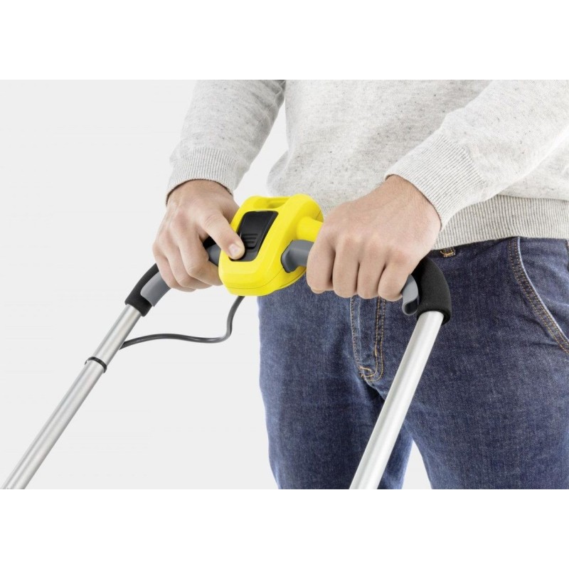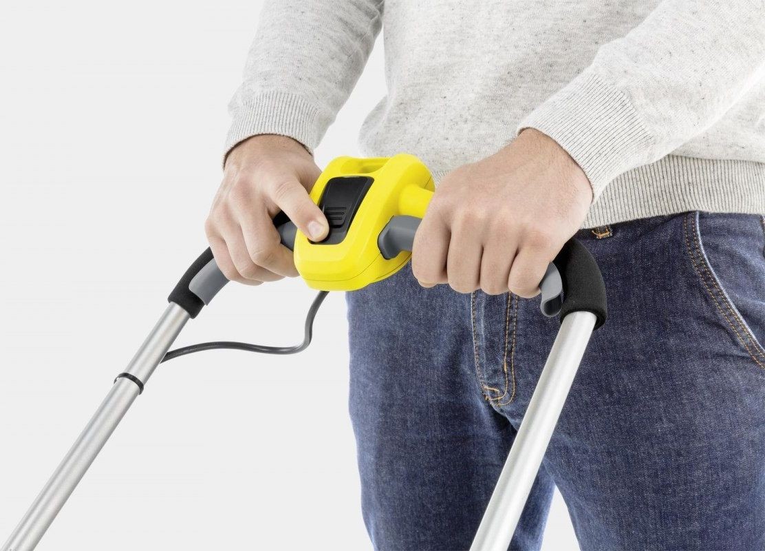 Urządzenie posiada wygodny uchwyt gąbkowy oraz włączniki po jego obu stronach. Wskaźnik napełnienia kosza informujący natychmiast o potrzebie opróżnienia jest bardzo praktyczny. Klucz bezpieczeństwa zapobiega nieumyślnemu uruchomieniu urządzenia przez dzieci. Dodatkowo uchwyt prowadzący z regulacją wysokości gwarantuje wygodną pozycję roboczą a składana konstrukcja pozwala oszczędzać miejsce przy przechowywaniu. Grzebienie ułatwiają koszenie do samego obrzeża bez pozostawiania nie skoszonej trawy. Zestaw zawiera baterię i szybką ładowarkę.