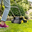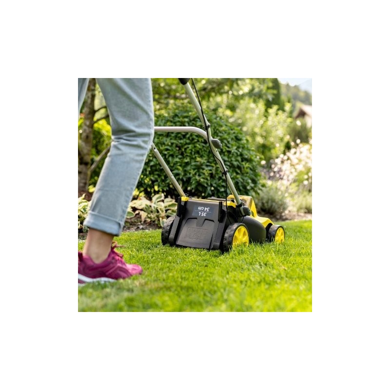 18-woltowa kosiarka akumulatorowa jest lekka, zwrotna i posiada mocny silnik bezszczotkowy. Trawniki o powierzchni do 350 m² są koszone szybko i precyzyjnie. Szerokość robocza wynosi 34 cm, a wysokość koszenia można dostosować do jednego z pięciu poziomów, w zakresie od 25 do 60 mm. Podczas koszenia inteligentny system zarządzania silnikiem iPower automatycznie dostosowuje prędkość do rodzaju trawy. Grzebienie do trawy unoszą źdźbła trawy przy krawędziach i obrzeżach trawnika, zapewniając, że żadne z nich nie zostanie pominięte. System koszenia 2-w-1 pozwala na równomierne rozrzucanie ścinek trawy po trawniku, które będą naturalnym nawozem w procesie mulczowania, lub zbieranie ich do dużego, 35-litrowego kosza na trawę, który zagwarantuje dłuższy czas pracy bez żadnych przerw. Wygodną, ergonomiczną pozycję pracy zapewnia uchwyt prowadzący o regulowanej wysokości. Składana rama oszczędza miejsce podczas przechowywania. Zintegrowane uchwyty ułatwiają przenoszenie kosiarki po schodach. Akumulator oraz ładowarka są dołączone do zestawu.