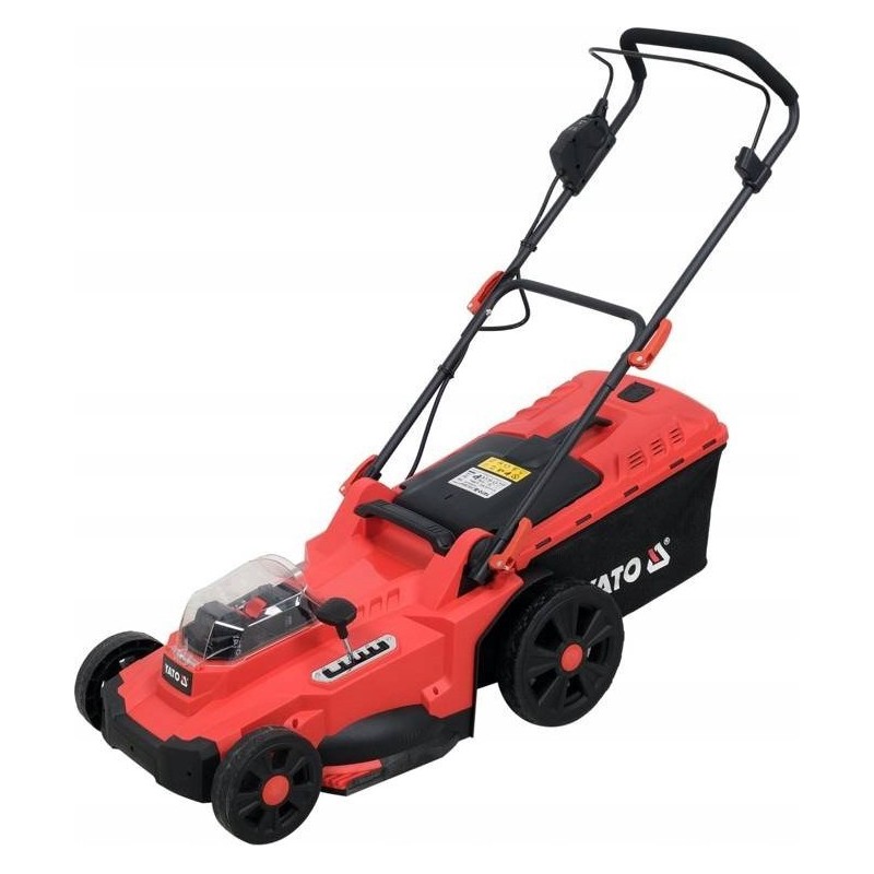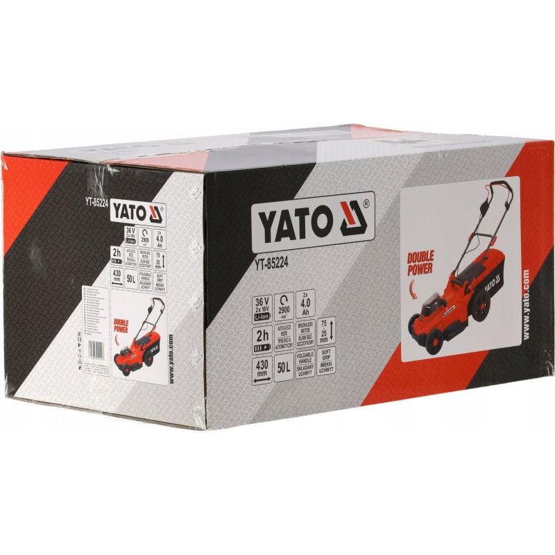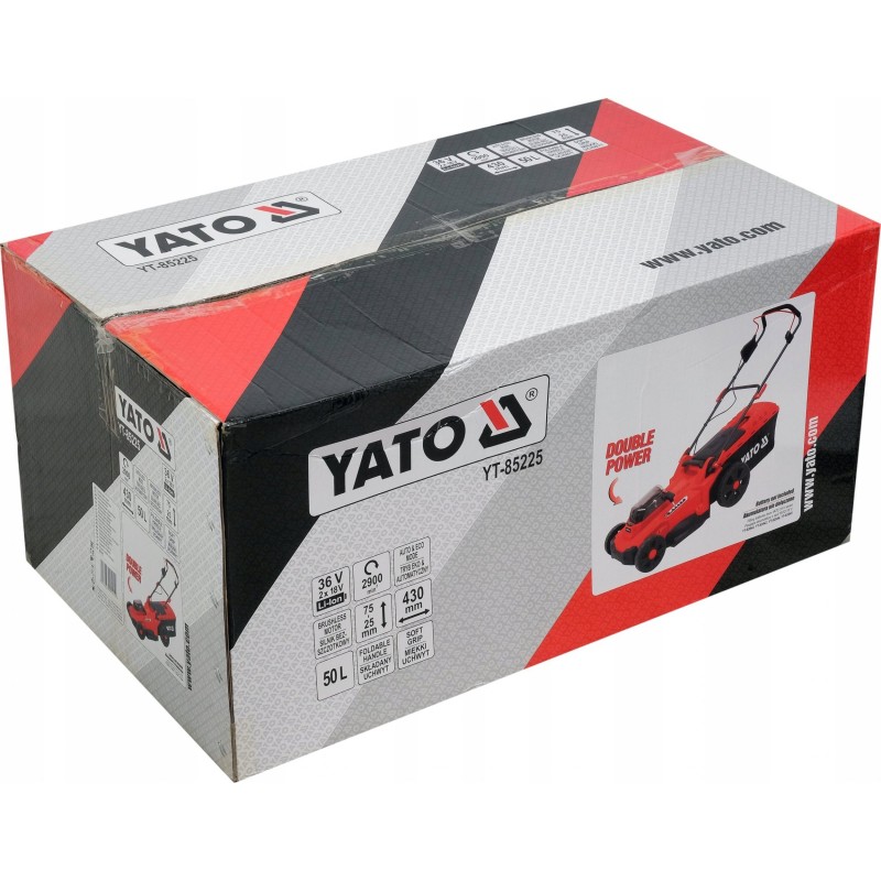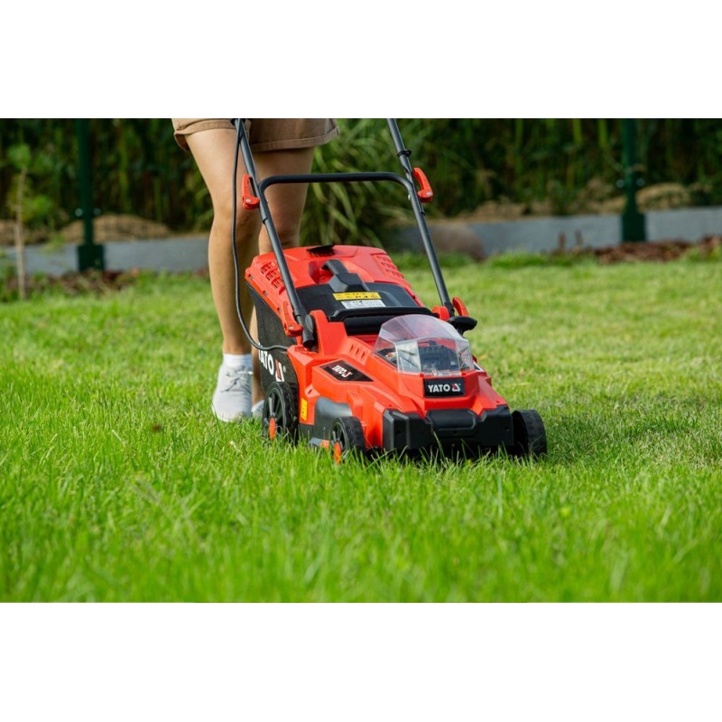 Kosiarka o podwójnej mocy akumulatorów systemu YATO wynoszącej 36 V zapewnia cichą i wygodną pielęgnację trawników. Użytkownik ma do wyboru 3 poziomy ustawienia wysokości uchwytu. Miękka gąbka zapewnia wygodny chwyt. Szybkozamykacze ułatwiają sprawne złożenie kosiarki do transportu i przechowywania. Kosiarkę można przechowywać w pionie, co dodatkowo oszczędza miejsce. Włącznik na uchwycie wyposażony jest w blokadę, która zapobiega przypadkowemu uruchomieniu. Urządzenie pracuje w trybie ECO (maksymalnie oszczędza baterię) lub AUTO (dostosowuje obroty silnika do obciążenia).