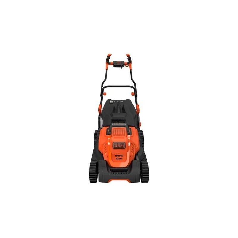 Elektryczna kosiarka Black&Decker BDBEMW481BH-QS to wygodne w obsłudze urządzenie, które sprawdzi się podczas koszenia przydomowych trawników. Kosiarka o mocy 1800W i szerokości cięcia 42cm umożliwia sprawne koszenie trawy. Dzięki 6-stopniowej regulacji wysokości cięcia trawnik można przyciąć według indywidualnych potrzeb. Kosiarkę Black&Decker wyposażono także w specjalną nakładkę kosza, która ułatwia zbieranie skoszonej trawy oraz uchwyt na kabel i duże koła dla wygodnego manewrowania. Na obudowie kosiarki umieszczono też praktyczny uchwyt umożliwiający przenoszenie urządzenia. Bezpieczeństwo użytkowania zwiększa natomiast włącznik, który posiada zabezpieczenie przed przypadkowym uruchomieniem.
