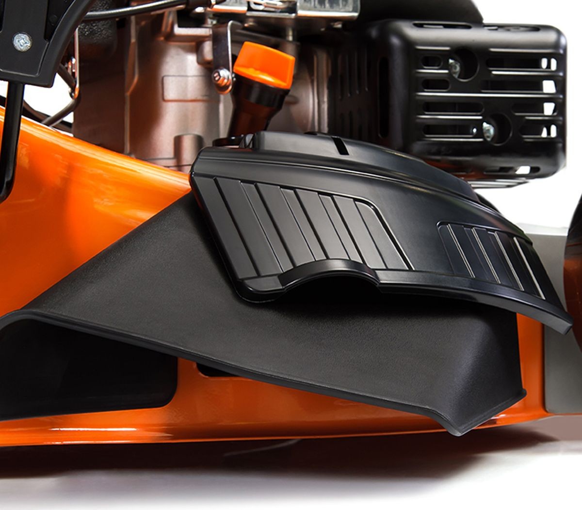 Dzięki tej funkcji kosiarka ma możliwość wyrzutu pokosu nie tylko w tył, a również na boki. Taki dodatek może zwiększyć Twój komfort w koszeniu trawnika, na przykład w momentach kiedy Twój kosz do zbierania trawy jest niedostępny, a Ty nie chcesz żeby pokos brudził ani Ciebie ani Twoich butów.