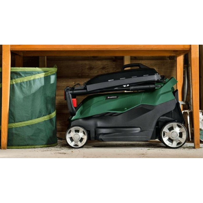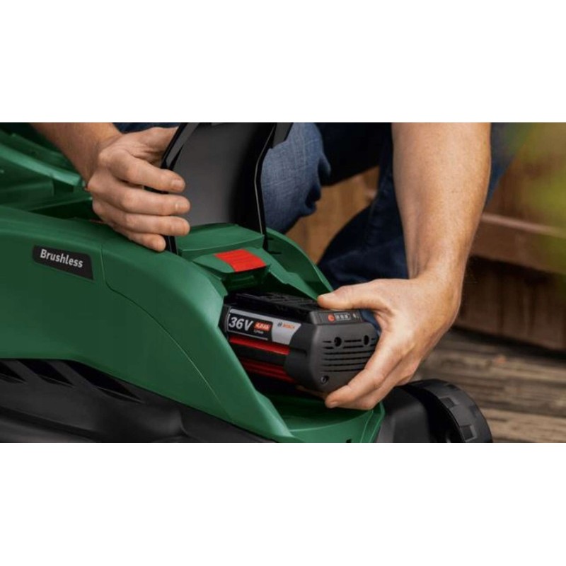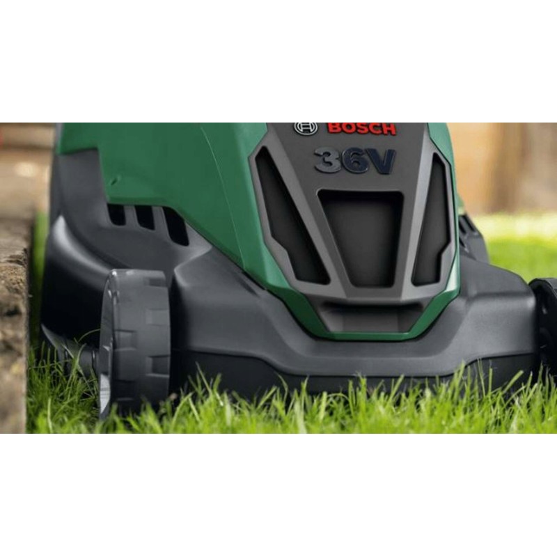 Kosiarka wykorzystuje innowacyjną technologię Bosch Syneon, która zapewnia optymalną moc oraz maksymalny czas pracy, co przekłada się na efektywność koszenia i komfort użytkowania.