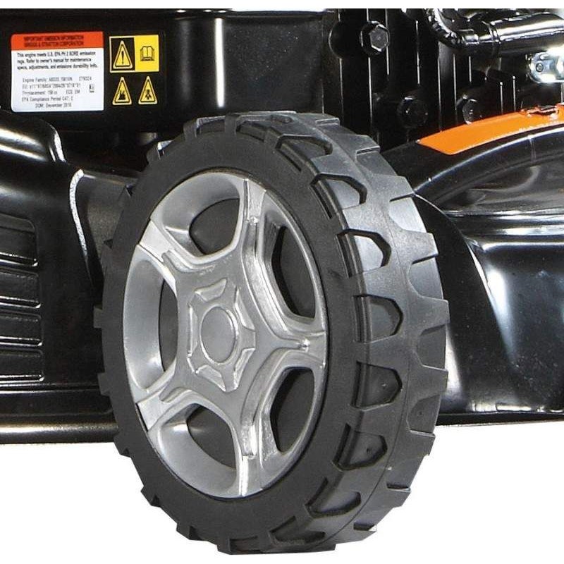 - Duże koła 200 mm – koła przednie i 280 mm – koła tylne. Konfiguracja gwarantująca większą płynność jazdy na nierównych terenach, większą zwrotność i łatwiejsze manewrowanie maszyną.