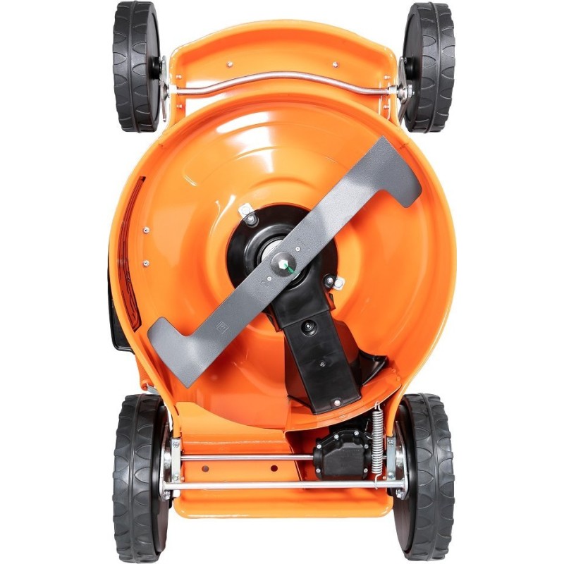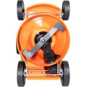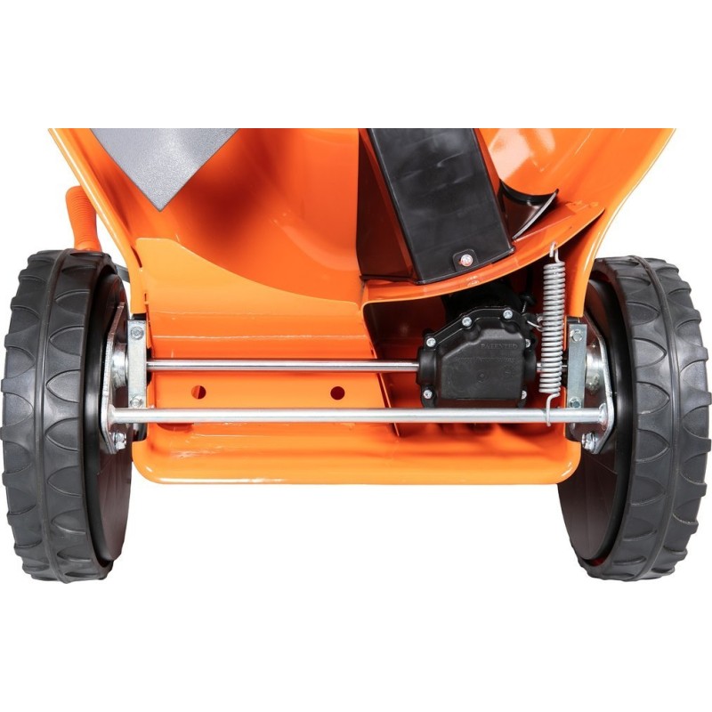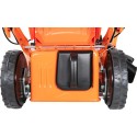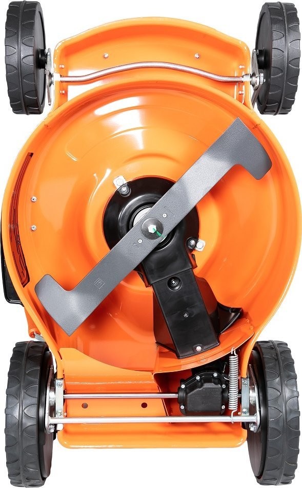Kosiarka została wyposażona w duże koła o średnicy 200 mm z przodu i 280 mm z tyłu, co zapewnia lepszą manewrowość oraz komfort jazdy, nawet na nierównym terenie. Dzięki temu koszenie staje się przyjemnością, a nie uciążliwym obowiązkiem.