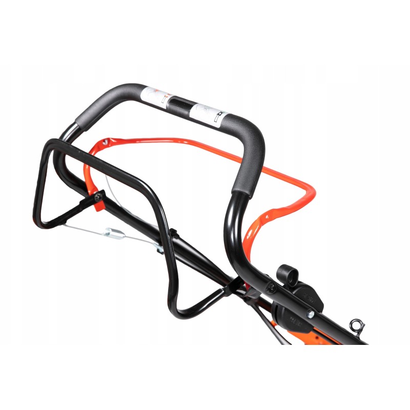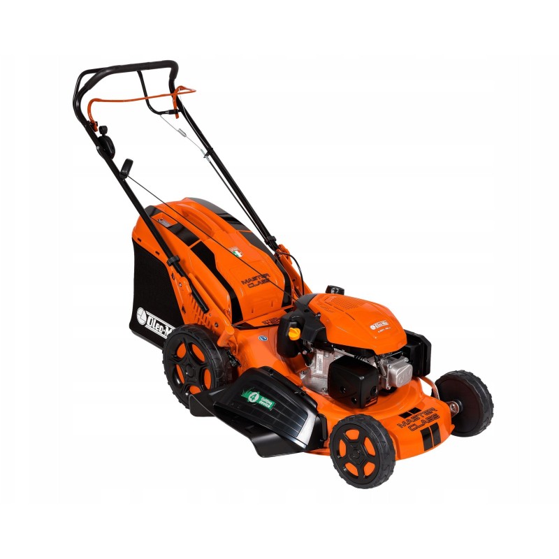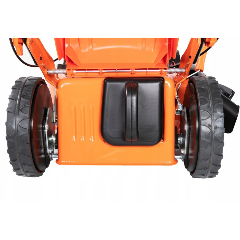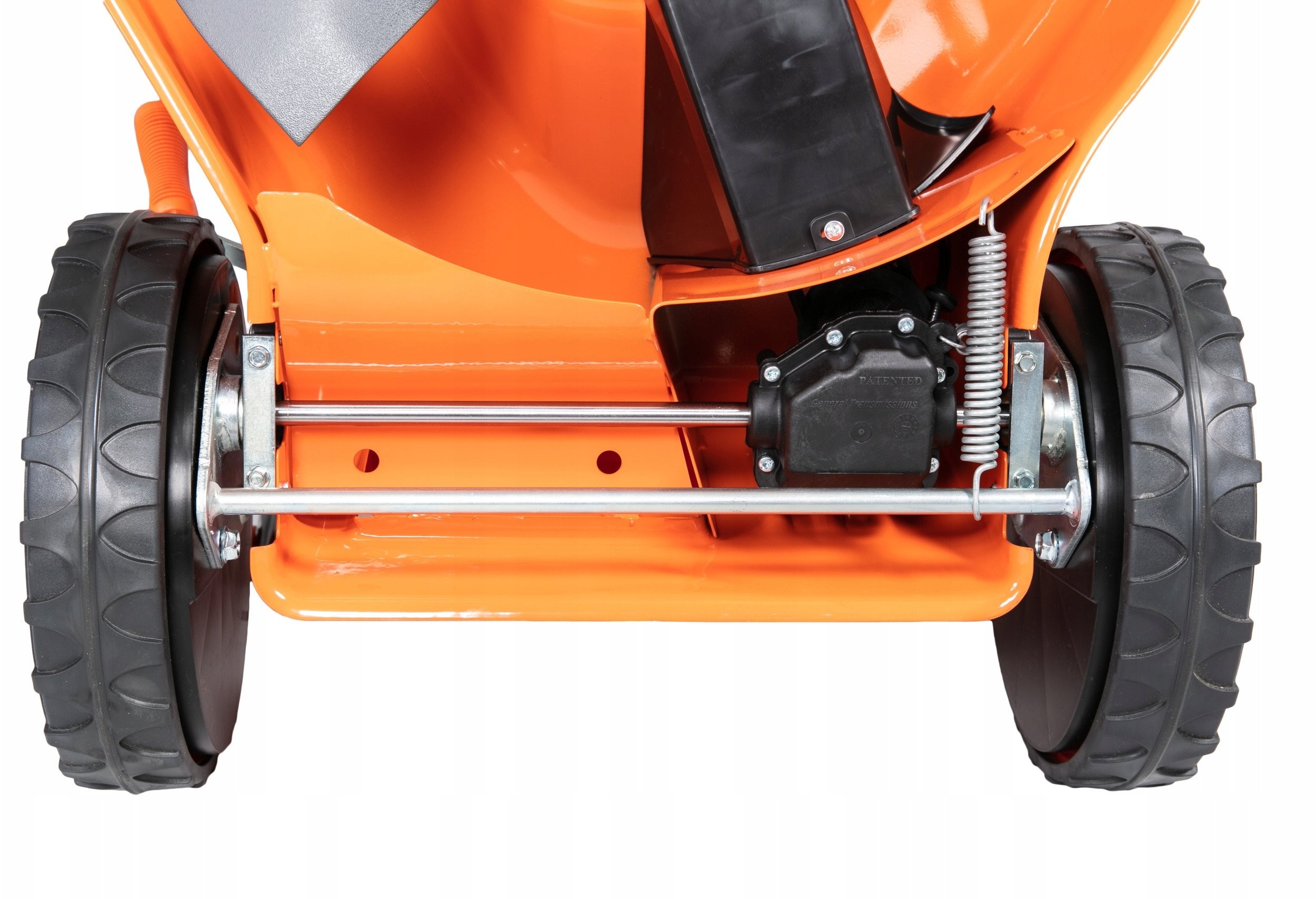 Kosiarka została wyposażona w koła o średnicy 200 mm z przodu i 280 mm z tyłu, co zapewnia lepszą zwrotność oraz komfort jazdy po nierównych terenach. Dzięki temu, praca staje się łatwiejsza i bardziej przyjemna.