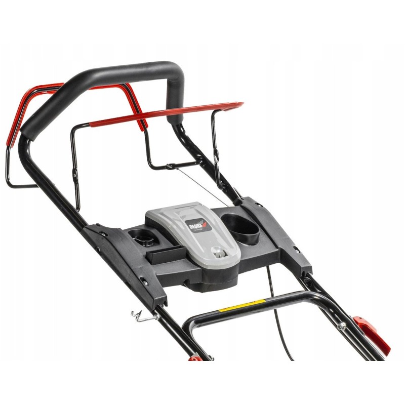 Ergonomiczna konstrukcja kosiarki oraz składana rączka zapewniają wygodę podczas użytkowania oraz łatwe przechowywanie. Duże koła na łożyskach ślizgowych gwarantują stabilność i manewrowość, co ułatwia pracę w ogrodzie.