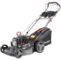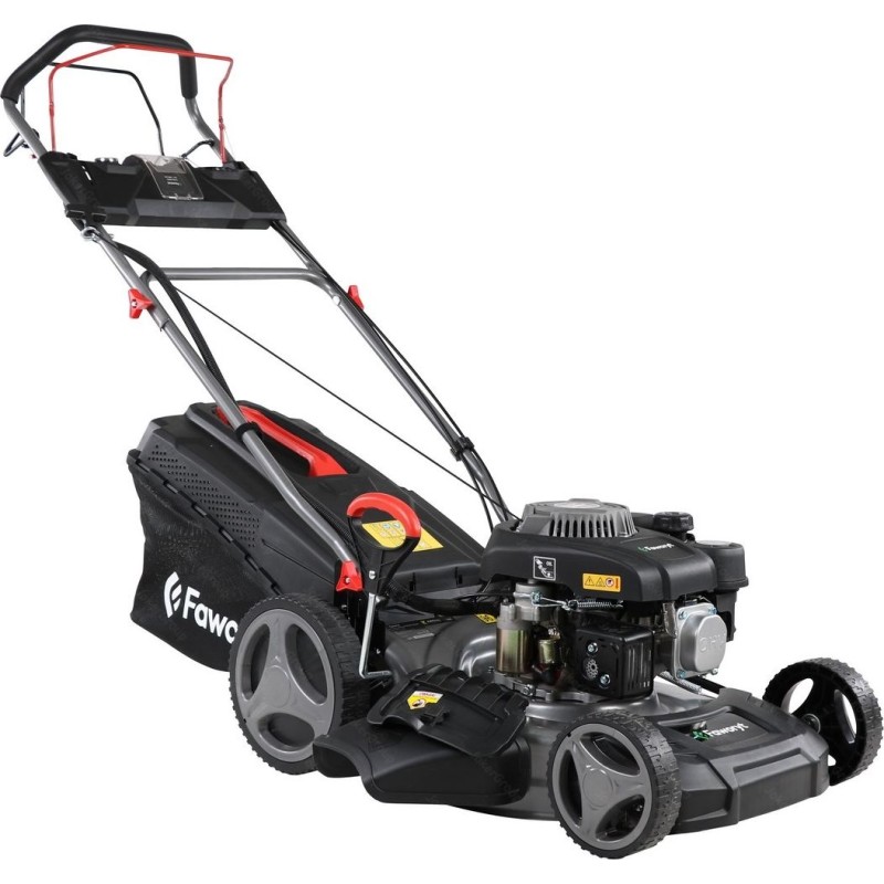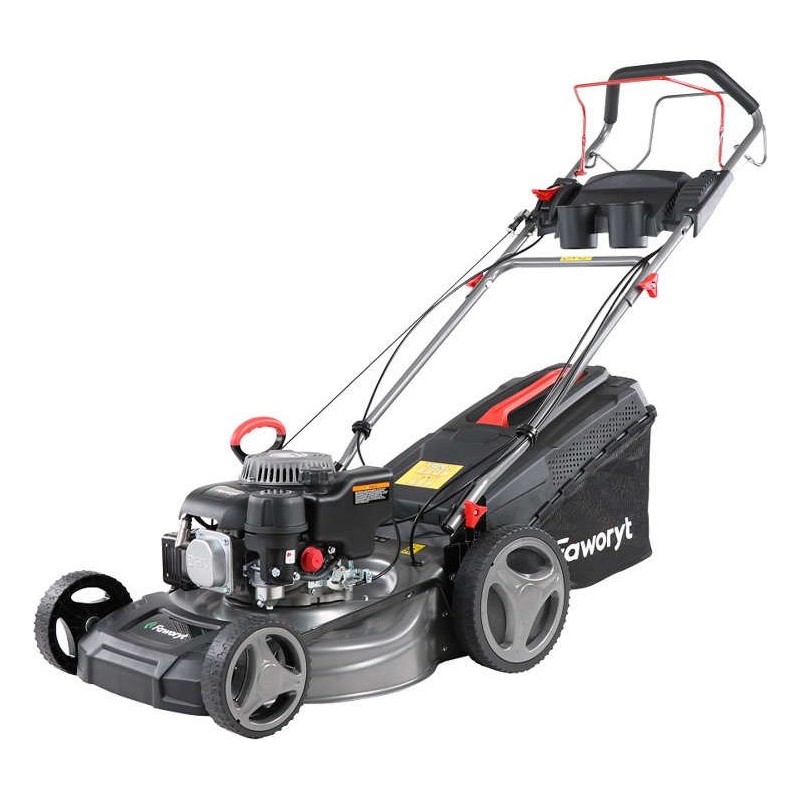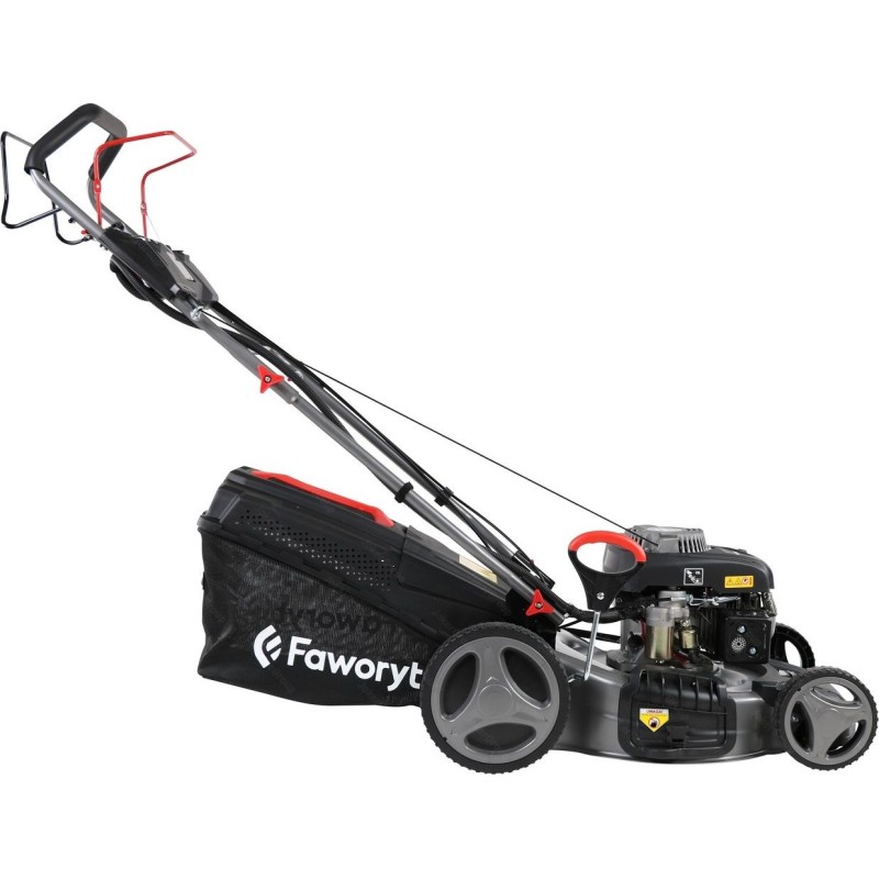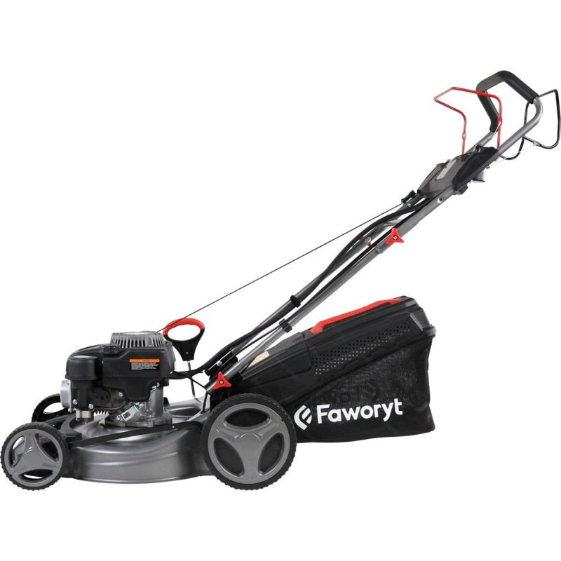 Typ silnika: spalinowy, czterosuwowy, górnozaworowy. Producent silnika: FAWORYT. Pojemność silnika: 150 cm3. Maksymalna moc silnika: 5,0 KM. Rozrusznik: elektryczny. Szerokość koszenia: 46 cm. Sposób napędu: napęd własny na tylne koła. Funkcje: wyrzut tylny, wyrzut do kosza, wyrzut boczny, mielenie (4w1). Regulacja wysokości koszenia: 5-stopniowa. Sposób regulacji wysokości: centralny dla wszystkich kół. Minimalna wysokość koszenia: 25 mm. Maksymalna wysokość koszenia: 75 mm. Obudowa: stalowa. Pojemność kosza na trawę: 55 l. Rodzaj kosza na trawę: siatkowy z plastikową pokrywą. Łożyskowane koła: tak. Panel na napój i klucze: tak.