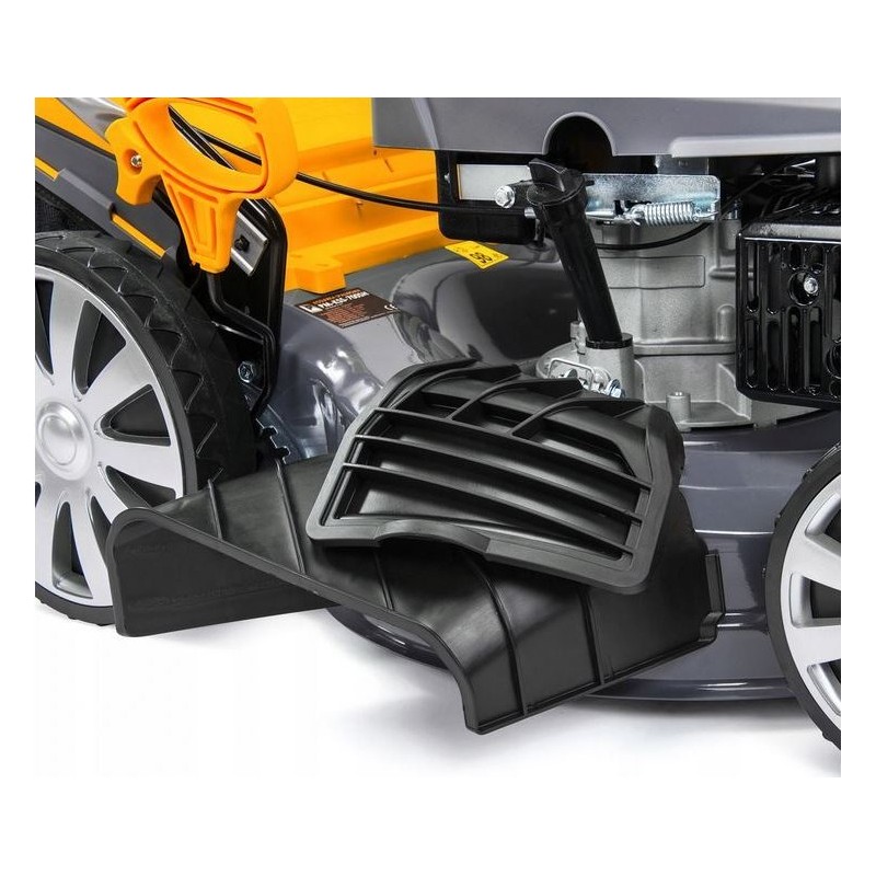 Dzięki tej funkcji kosiarka ma możliwość wyrzutu pokosu nie tylko w tył, a również na boki. Taki dodatek może zwiększyć Twój komfort w koszeniu trawnika, na przykład w momentach kiedy Twój kosz do zbierania trawy jest niedostępny, a Ty nie chcesz żeby pokos brudził ani Ciebie ani Twoich butów.