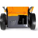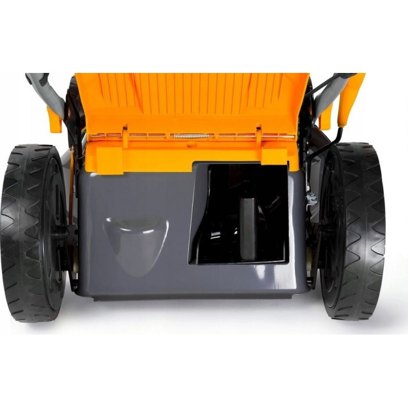 Kosiarka charakteryzuje się solidną metalową obudową, co zapewnia jej trwałość oraz odporność na korozję. Dodatkowo, hartowane noże gwarantują długotrwałą wydajność i skuteczność w koszeniu.