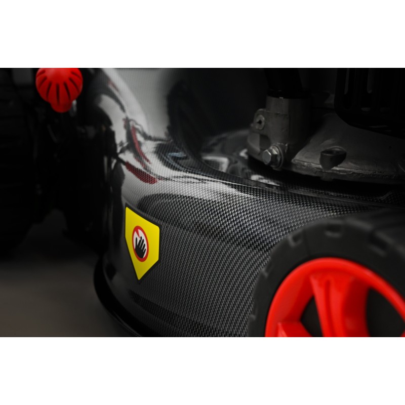 - Karbonowy wzór przyciąga wzrok i wyróżnia sprzęt – dzięki nowoczesnemu wykończeniu kosiarka prezentuje się profesjonalnie i prestiżowo, co może mieć znaczenie zwłaszcza dla firm świadczących usługi ogrodnicze.