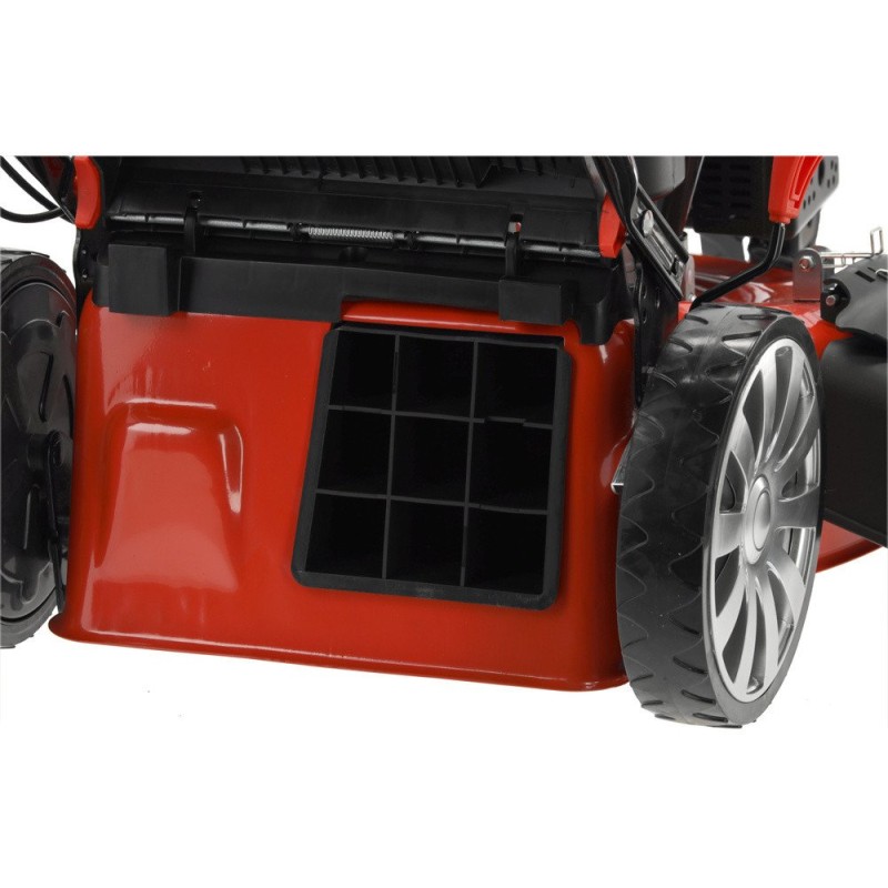 Ergonomiczny uchwyt wykończony pianką zapewnia komfort użytkowania, a duże koła ułatwiają manewrowanie, nawet w trudnodostępnych miejscach. Kosiarka została zaprojektowana z myślą o wygodzie, co sprawia, że praca z nią to czysta przyjemność.