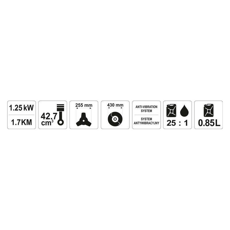 - zakres koszenia: żyłka 430 mm, tarcza 255 mm