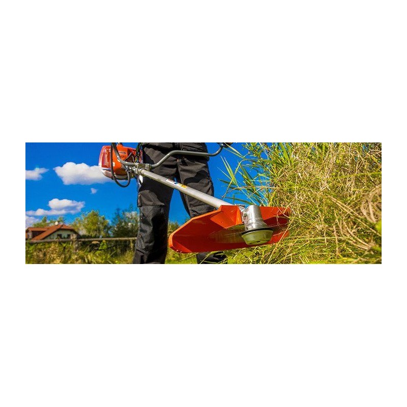 - Głowica tnąca to nowa wersja niezawodnej głowicy żyłkowej “Tap & Go” wyposażonej w nylonową żyłkę 2,4mm, której długość można łatwo zwiększyć poprzez uderzenie wirującą głowicą w podłoże podczas cięcia trawy, co pozwala na nieprzerwaną pracę.