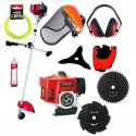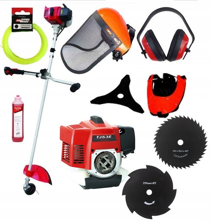 Kosa spalinowa KAWASAKI TJ53E jest dostarczana z bogatym zestawem akcesoriów, w tym różnymi tarczami tnącymi, głowicą żyłkową, podwójnymi szelkami, nausznikami oraz osłoną twarzy. W zestawie znajduje się również olej do mieszanki paliwowej oraz klucze montażowe, co czyni ją kompletnym narzędziem do pracy w ogrodzie.