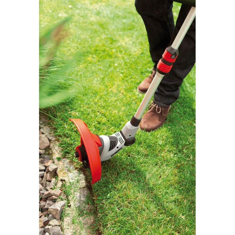 Dzięki głowicy obracającej się pod kątem 180 można precyzyjnie przyciąć także zwisające brzegi trawnika pielęgnacja trawy aż po same końce (GTE 450/550, GTI 18V). Teleskopowa aluminiowa rura podkaszarki i elastyczny uchwyt zapewniają prawidłowe położenie i pozycję roboczą podkaszarki. Dzięki nim regulacja podkaszarki przebiega łatwo i szybko.