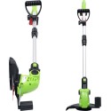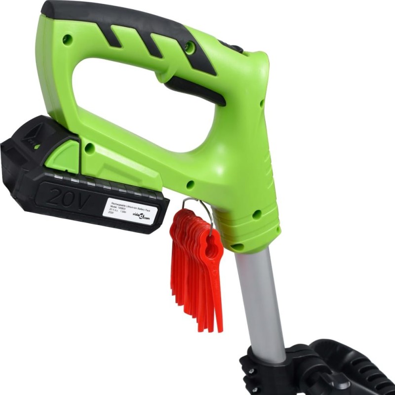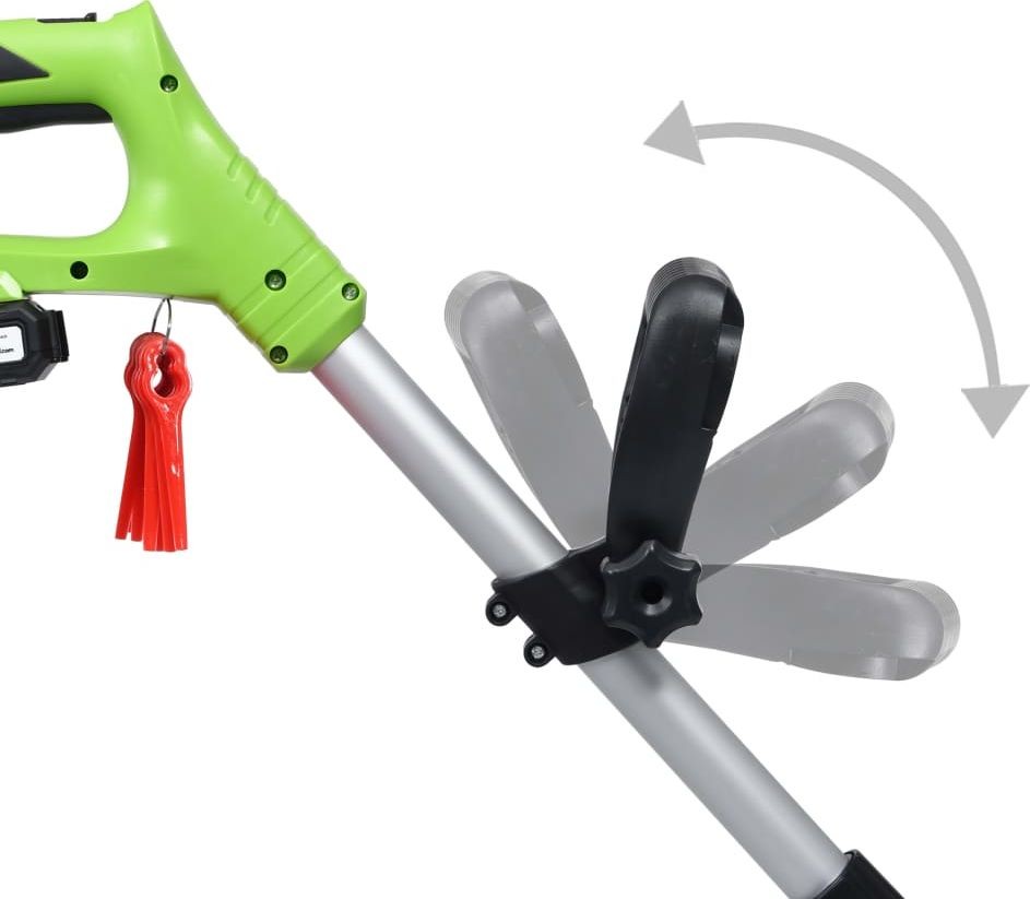 Trymer ogrodowy ma teleskopowy drążek, który można przedłużyć do 120 cm. Obrotowa konstrukcja głowicy pozwala łatwo przełączać tryby przycinania i wyrównywania obrzeży. Pomocniczy uchwyt jest regulowany, aby zapewnić naturalną i wygodną pozycję pracy. Bezprzewodowa konstrukcja zwiększa elastyczność, ponieważ nie powoduje ograniczeń związanych z przewodem zasilającym, które pojawiają się przy produktach 220 V. Nie powoduje również kłopotów często związanych z użyciem narzędzi benzynowych, takich jak spaliny oraz zużycie benzyny i oleju. Narzędzie ogrodnicze jest łatwe w obsłudze i przyjazne dla użytkownika dzięki kompaktowej budowie i lekkości.