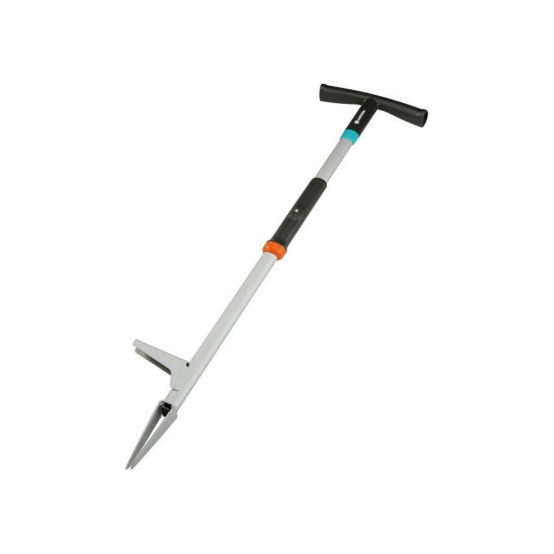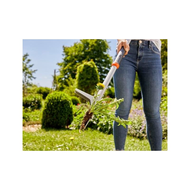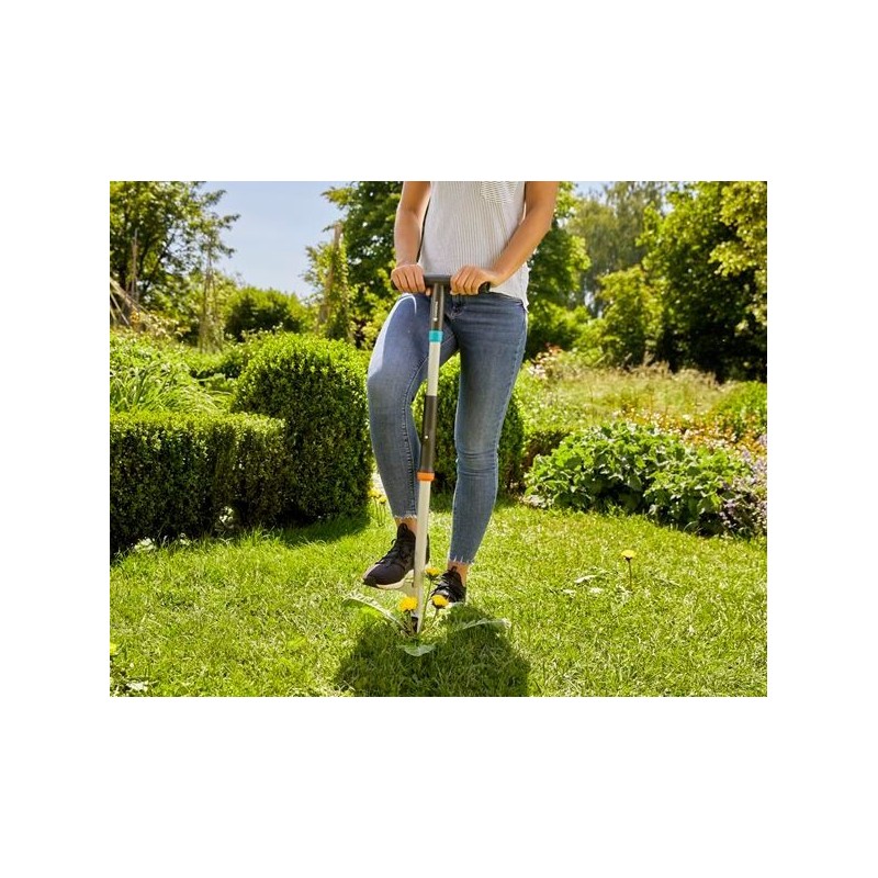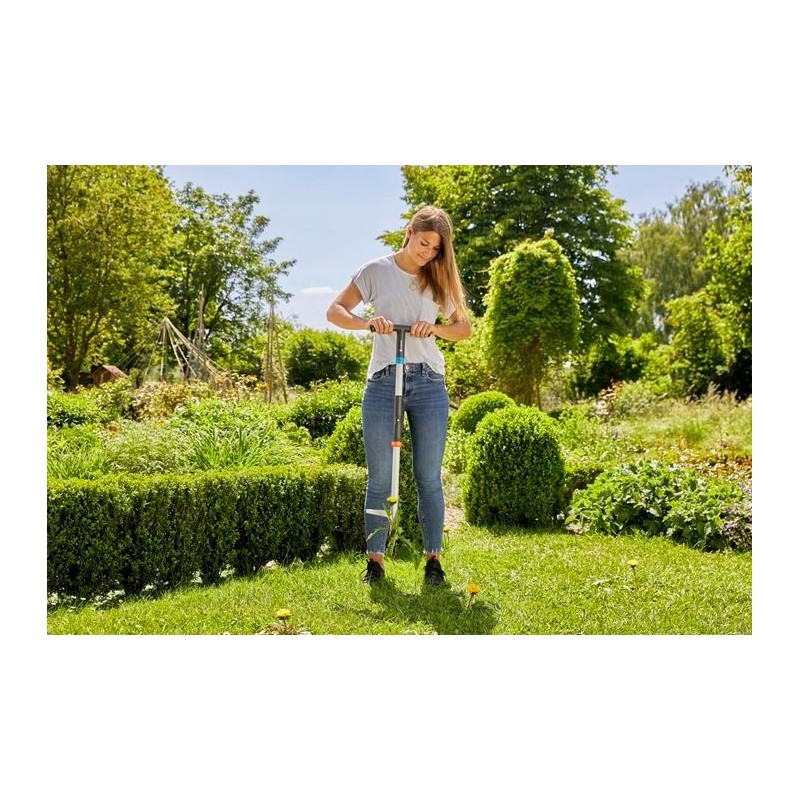 Gardena środek chwastobójczy Ta wyrywacz do chwastów z Gardena to idealne narzędzie do usuwania uciążliwych chwastów. Opatentowane ostrza wyrywacza do chwastów są umieszczone blisko siebie i bardzo wąskie. Ta konstrukcja jest bardzo przydatna do wyrywania mniszka lekarskiego na trawniku. Dzięki tej wycinarce do chwastów możesz pracować precyzyjnie, a Twoje plecy nie są obciążone. Posiada praktyczny podnóżek w dolnej części, który ułatwia wkopywanie się w ziemię. Specjalnie wyprofilowana rączka zapewnia wygodny ruch podczas obracania ostrza pielącego. Zintegrowany mechanizm zwalniający ułatwia pracę z chwastami na zewnątrz. Ta metoda odchwaszczania działa czysto mechanicznie i bez użycia środków chemicznych. Specyfikacja: Kolor: szary, czarny Materiał: tworzywo sztuczne Długość: 100 cm Szerokość uchwytu: 27 cm