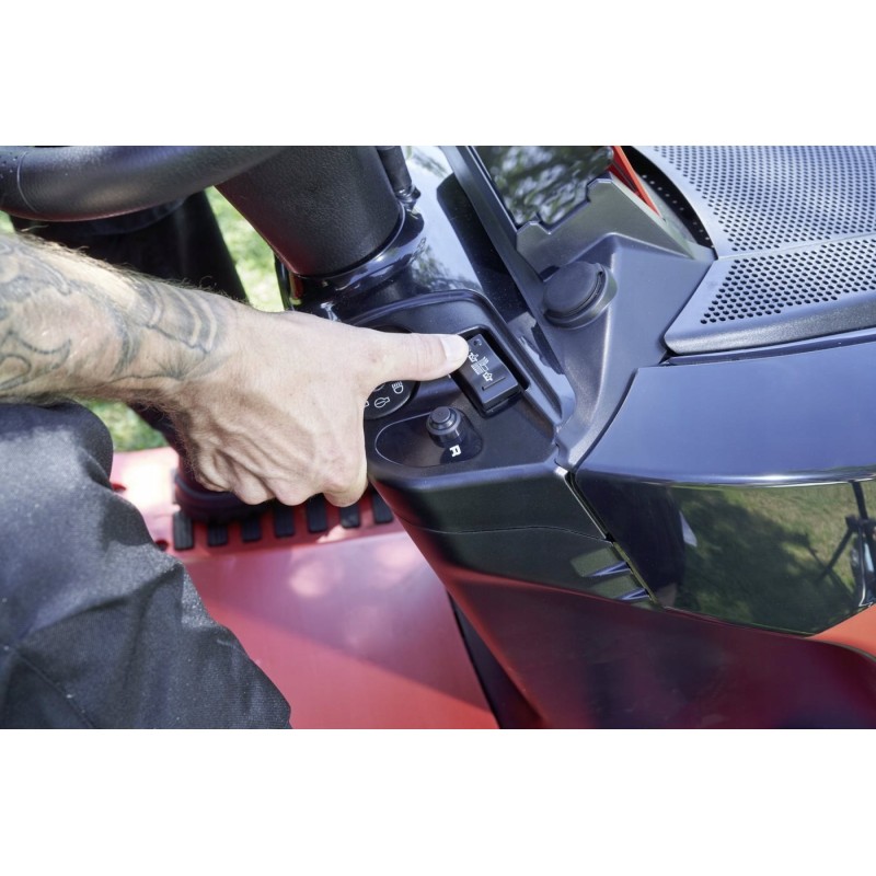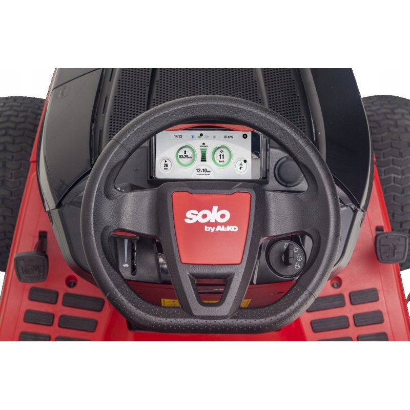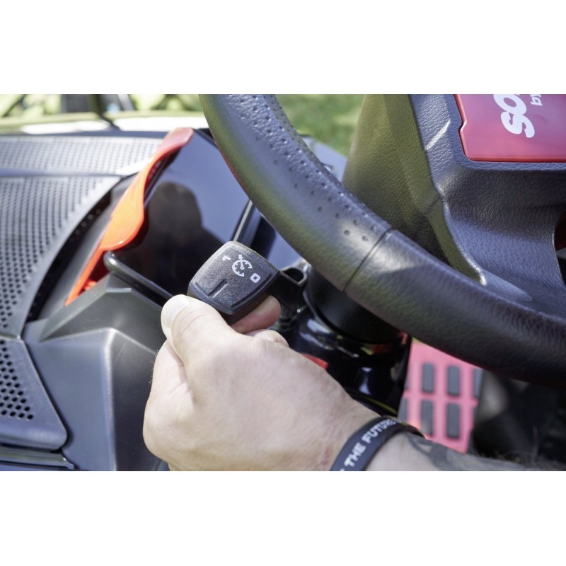 Traktor został wyposażony w innowacyjną funkcję SMART COCKPIT, dzięki której do traktora możemy podłączyć nasz smartfon zarówno z systemem Android, jak i iOS. Po podłączeniu smartfon wyświetla najważniejsze informację dotyczące pracy traktora, takie jak: poziom paliwa, efektywność koszenia, aktualny czas pracy, licznik moto godzin, prędkość, nachylenie oraz napięcie akumulatora.