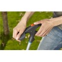 Długi aluminiowy uchwyt pozwala kosić trawnik w pozycji wyprostowanej, bez konieczności schylania się. Regulowany, wyprofilowany uchwyt łatwo dostosować do wzrostu użytkownika.