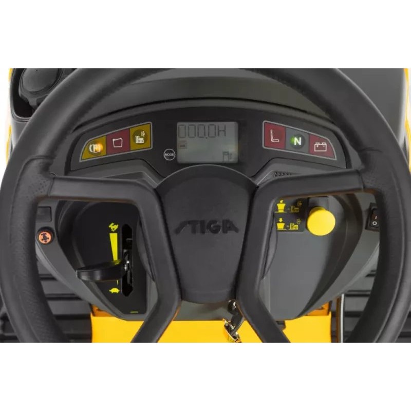 Traktor został wyposażony w wygodny fotel STIGA Plus z regulacją oraz kierownicę premium z miękkim uchwytem, co zapewnia komfort podczas długotrwałej pracy. Dodatkowo, przednie światła LED zwiększają bezpieczeństwo i komfort użytkowania w trudnych warunkach oświetleniowych.