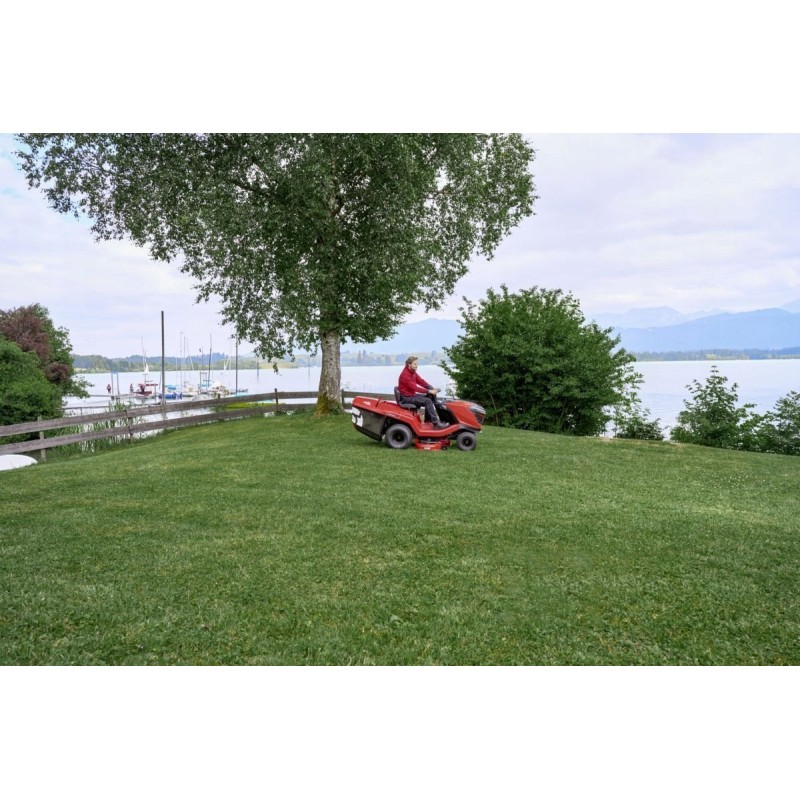 AL-KO Traktor Ogrodowy T 22-105.4 HD-A V2 jest napędzany przez przekładnię hydrostatyczną, której kultura pracy może zadowolić nawet najbardziej wymagających użytkowników. Przede wszystkim jest to jednostka cicha, charakteryzująca się płynnym działaniem. Ten nowy model traktora ma zoptymalizowany układ napędowy, co poprawia wydajność maszyny i umożliwia osiąganie większych prędkości (11km/h). Poprawienie prowadzenia pasa napędowego skutecznie i efektywnie przekazuje większą moc na tylną oś. Oznacza to nie tylko szybszą jazdę, ale także szybsze koszenie - dla maksymalnej wydajności. Działanie skrzyni nie różni się od tych, stosowanych w samochodach. Prędkość jazdy reguluje się za pomocą dwóch pedałów, umieszczonych obok siebie. Wciskamy pedał mocniej, przyspieszamy, popuszczamy nacisk, zwalniamy.