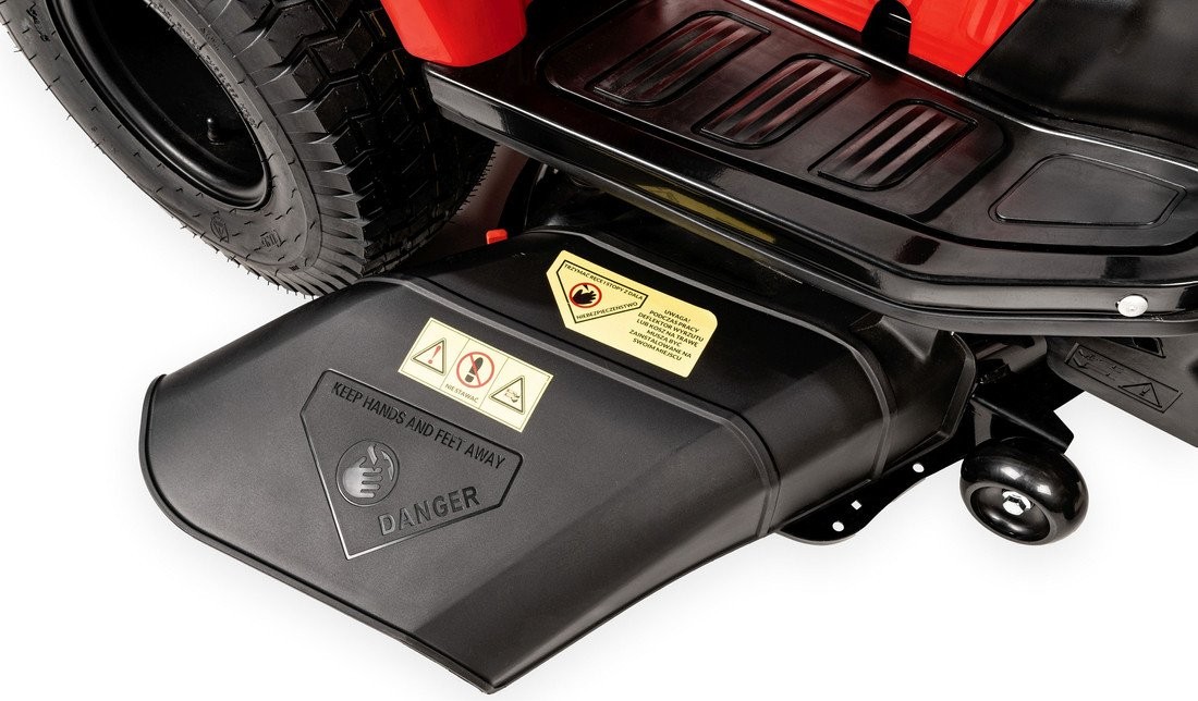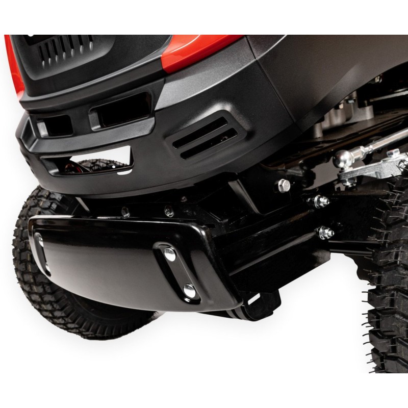 - Szeroki przedni zderzak ze stali wysokiej wytrzymałości, który chroni kosiarkę w przypadku przypadkowego uderzenia.