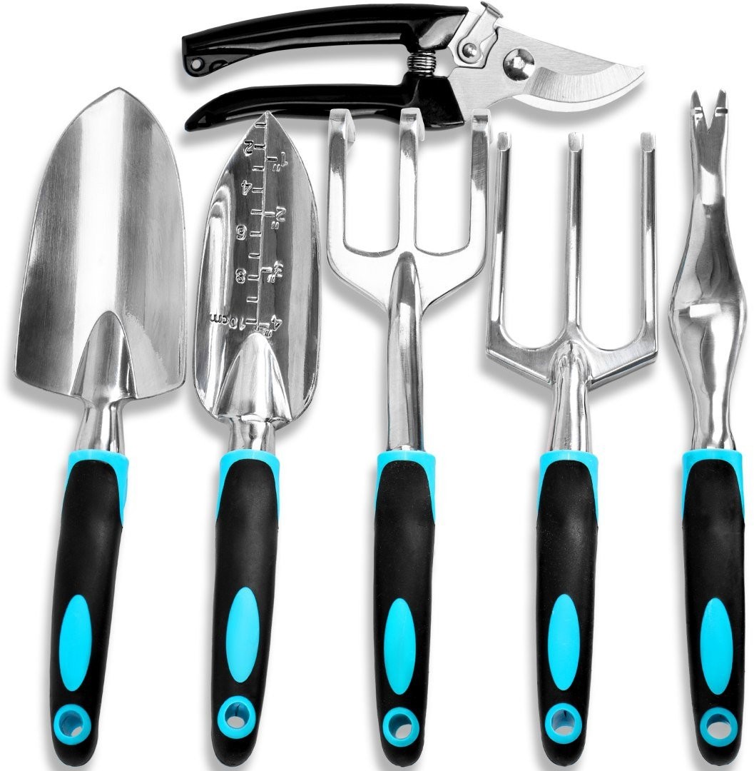 Kompletny zestaw sześciu narzędzi ogrodniczych, stworzony z myślą o solidności i trwałości, wykonany z wysokiej jakości aluminium, który sprosta każdemu wyzwaniu w ogrodzie.