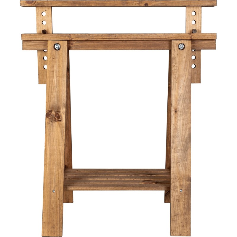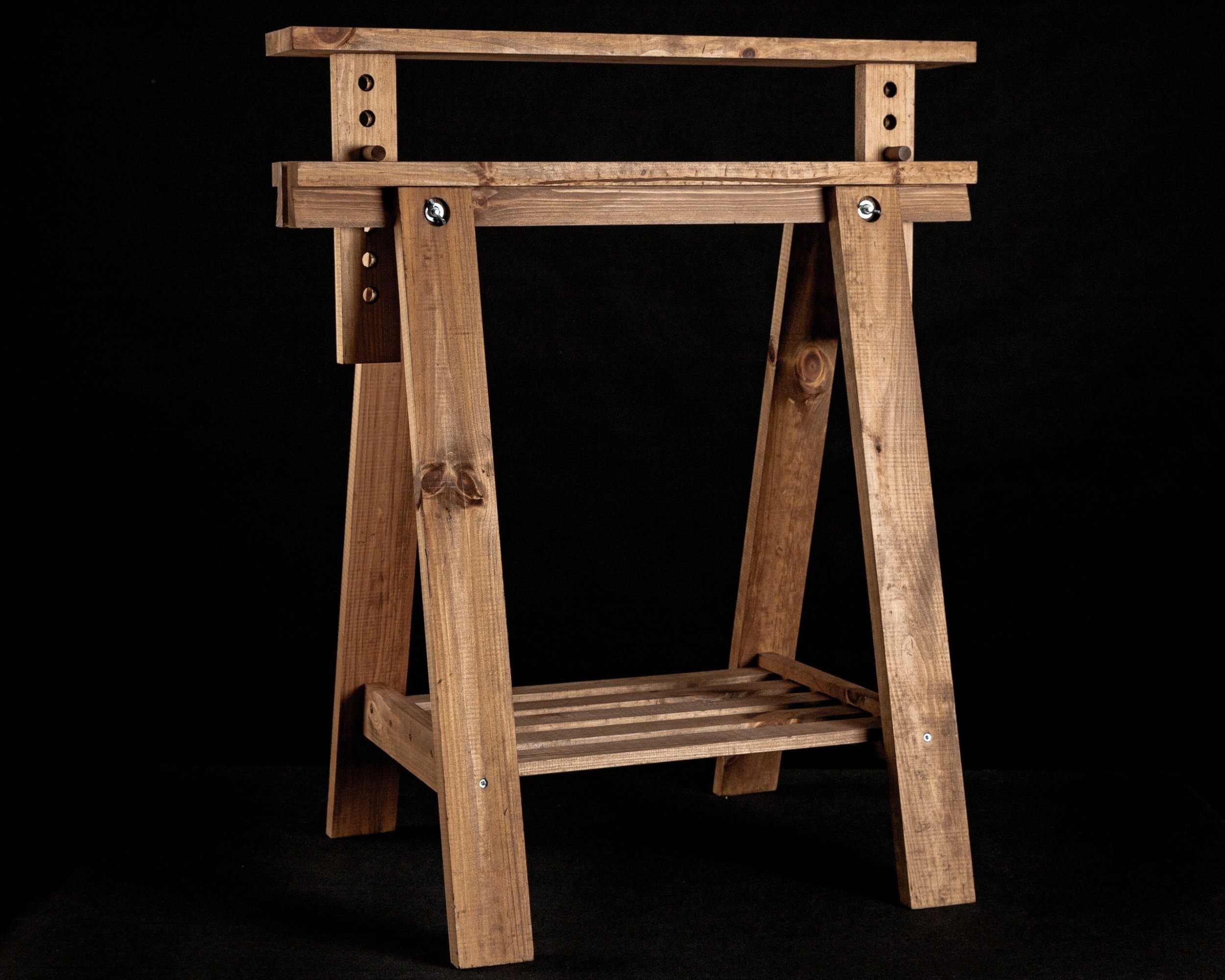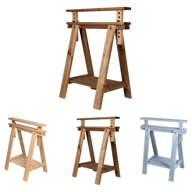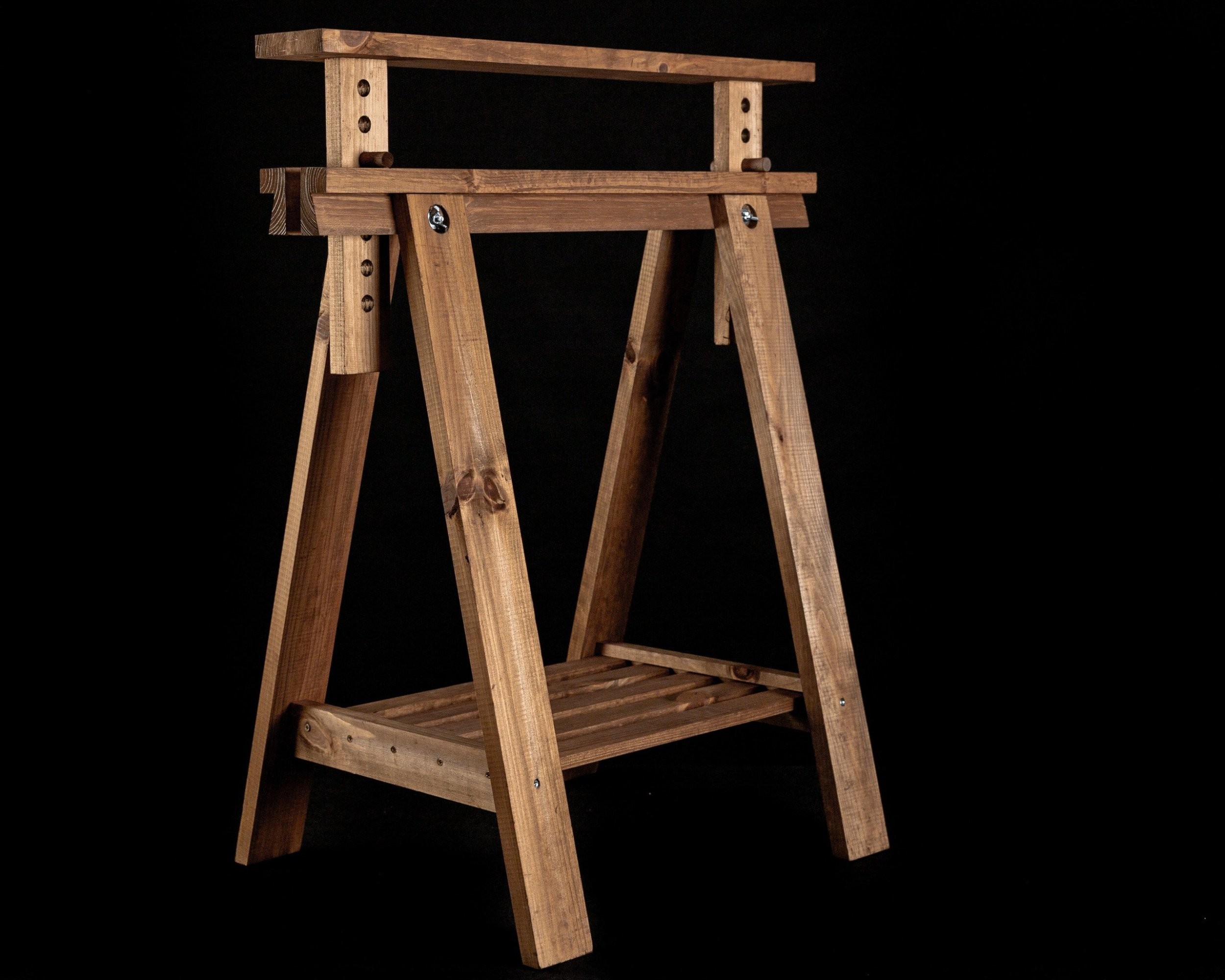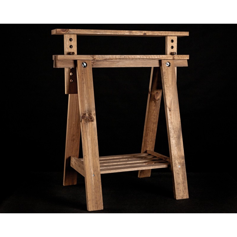 Koziołek o regulowanej wysokości. Stojak o szerokim spektrum zastosowań wykonany z surowego i nieimpregnowanego drewna sosnowego.