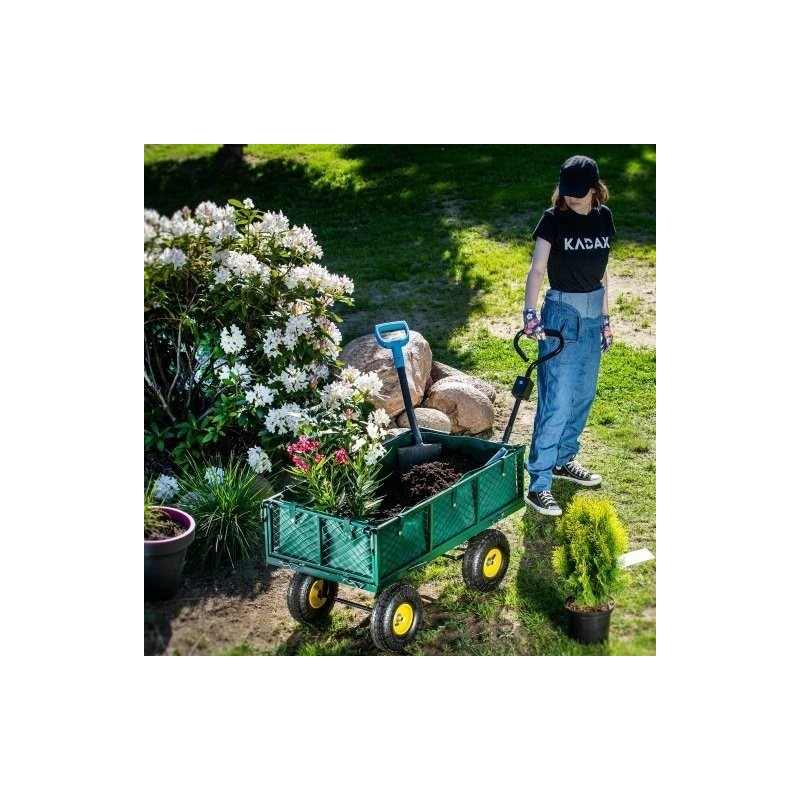 Jest użyteczny podczas prac ogrodowych, porządków oraz przewożenia małych przedmiotów. Wyposażony w cztery duże koła tylne i obrotowe koła przednie o 360°, umożliwia łatwe poruszanie się po nierównym terenie i utrzymuje stabilność transportowanego ładunku. Ponadto, koła mają hamulce, co zapewnia bezpieczeństwo podczas postoju.