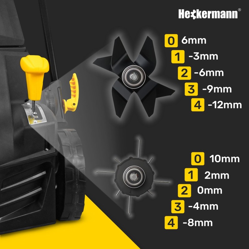 Wertykulator oferuje 5-stopniową regulację głębokości pracy w zakresie od -12 mm do +6 mm, co pozwala na idealne dostosowanie narzędzia do indywidualnych potrzeb trawnika.