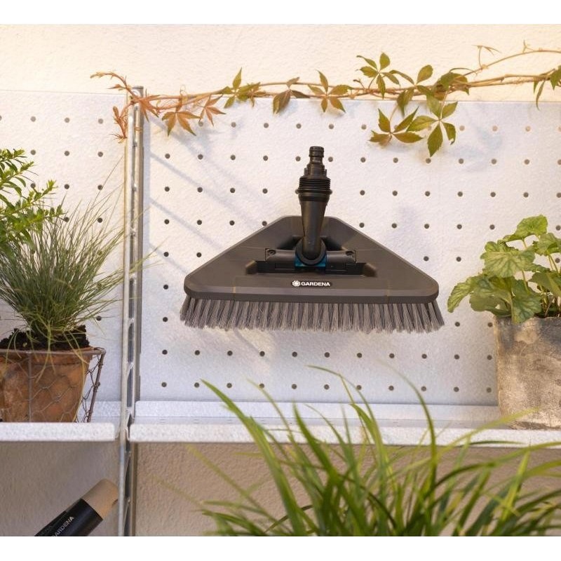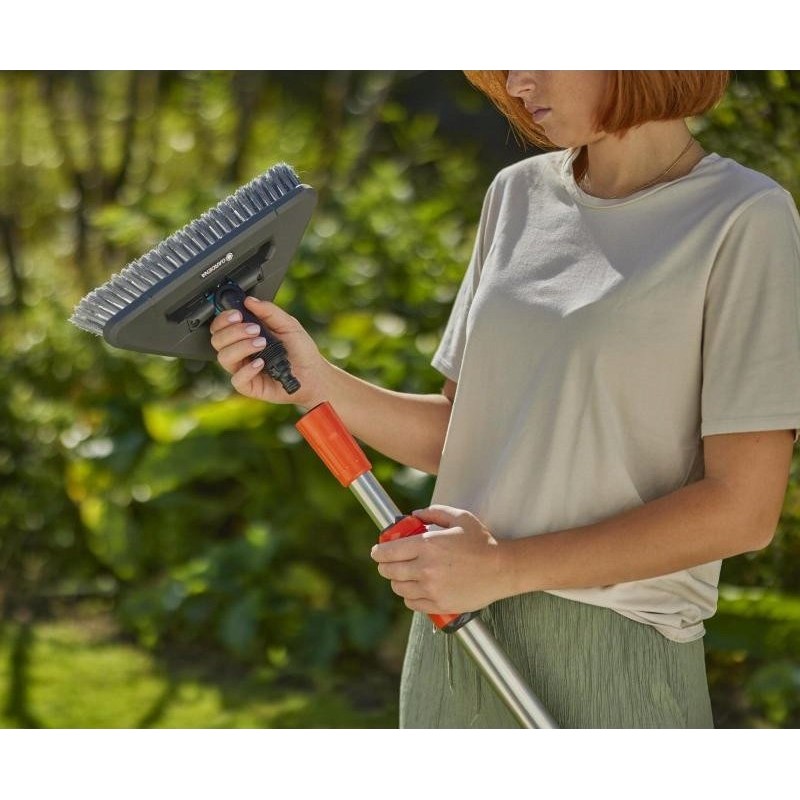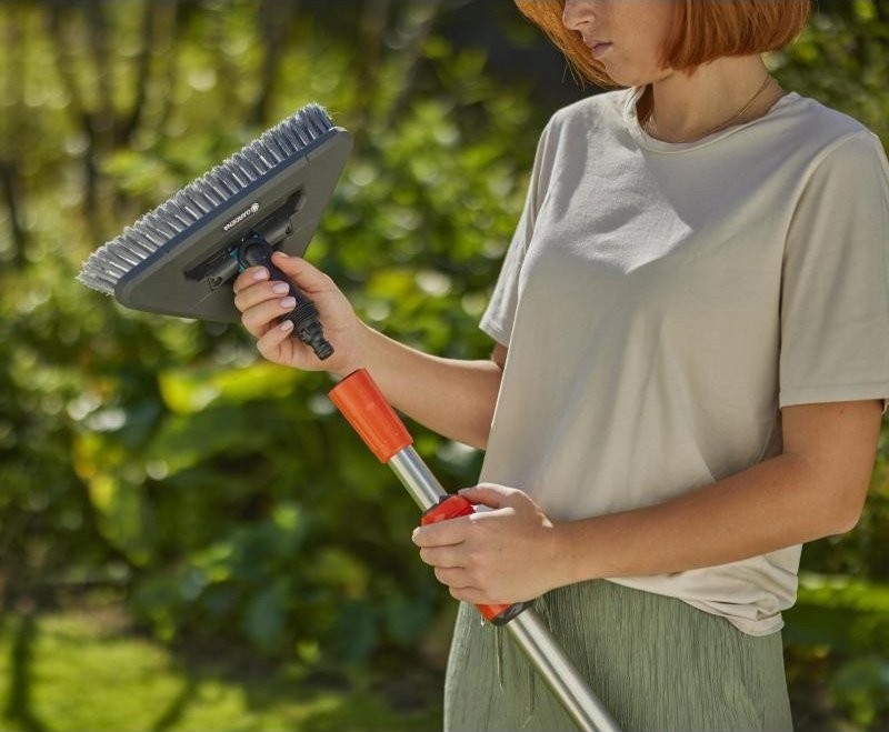 Narzędzie do mycia miękka szczotka Flex Gardena to idealne narzędzie do szybkiego czyszczenia dużych powierzchni. Wystarczy podłączyć CleanSystem do węża ogrodowego i przymocować szczotkę. Używanie jest proste, a efekty są imponujące.