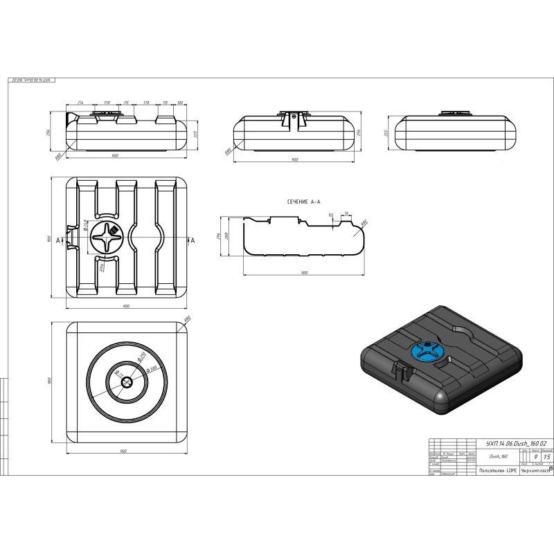 Zbiornik prysznicowy o pojemności 160 l. Dzięki temu zbiornikowi można łatwo skonstruować letni prysznic w każdych warunkach. Zbiornik prysznicowy jest czarny, więc woda w nim szybko się nagrzewa. W dolnej ściance zbiornika znajduje się gwintowany otwór 1/2 cala, który umożliwia wkręcenie zaworu kulowego. Dzięki zwężonemu dnu woda całkowicie odpływa ze zbiornika.