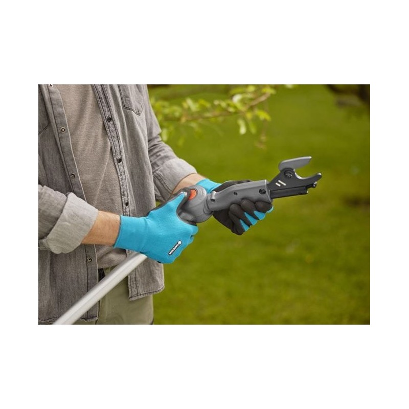 Głowica umożliwia cięcie gałęzi pod kątem 60 stopni. Ostrze pokryte specjalną powłoką, która skutecznie zapobiega przywieraniu resztek po cięciu. Na końcu narzędzia znajduje się hak, który ułatwia ściąganie odciętych gałęzi z drzewa. Na trzonku znajduje się wskaźnik LED informujący o stanie naładowania akumulatora. W pełni naładowany akumulator pozwala na wykonanie około 400 cięć. Akumulator litowo-jonowy o napięciu 18V.
