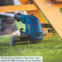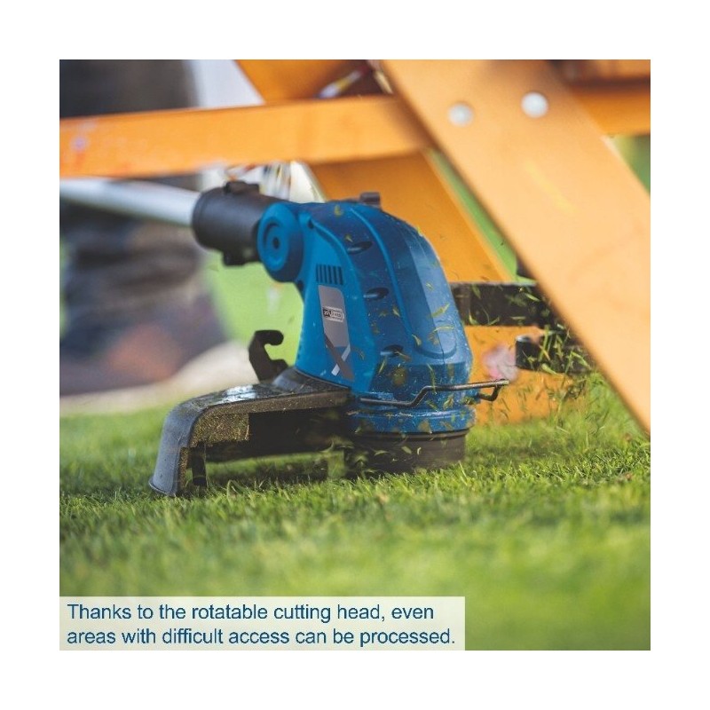 SPECYFIKACJE Wymiary (D x S x W): 1235 x 335 x 356 mm Typ silnika: Silnik szczotkowy Napięcie akumulatora: 20 V Maksymalna szerokość cięcia: 300 mm Długość żyłki: 3 m Regulacja wysokości: Do 270 mm Regulacja kąta: 0° – 90° Głowica tnąca: Obracana