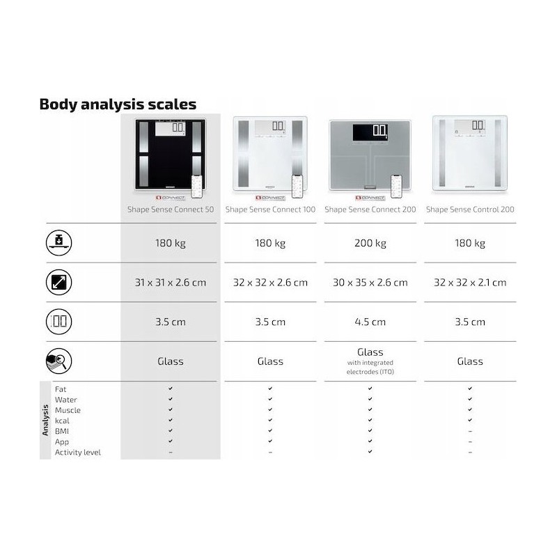 Dla wszystkich tych, którzy chcą żyć zdrowiej: analityczna waga łazienkowa Shape Sense Connect 50 od Soehnle. Urządzenie wyposażone w technologię BIA precyzyjnie określa wagę ciała i inne parametry, takie jak zawartość tkanki tłuszczowej, wody i masy mięśniowej, jak również pozwala ustalić wskaźnik BMI (Body-Mass-Index). Dodatkowo, aplikacja Soehnle Connect pomoże Ci monitorować na bieżąco Twoje dane z analitycznej wagi łazienkowej Shape Sense Connect 50. Dzięki aplikacji możesz mieć pod kontrolą wszystkie dane dotyczące Twojego ciała i poziomu kondycji fizycznej. Monitoruj różnicę w stosunku do ostatniego ważenia lub sprawdź, czy założony cel został osiągnięty. Aplikacja pomaga kontrolować masę ciała i w przejrzysty sposób pokazuje postępy. Jest intuicyjna w obsłudze i daje pełną kontrolę nad danymi. Sam decydujesz o tym, czy Twoje dane będą przechowywane tylko na smartfonie, czy również na serwerze. Nasza aplikacja zawiera również porady pomocne w osiąganiu założonych celów, a także umożliwia dzielenie się swoimi postępami ze znajomymi. Oczywiście naszą aplikację możesz powiązać z innymi aplikacjami fitnessowymi, takimi jak „Google fit” czy „Apple health”. Płaska konstrukcja i antypoślizgowe nóżki zapewniają stabilność. Duża tafla hartowanego szkła gwarantuje stabilną pozycję przy ważeniu. Waga wyświetla pomiar z dokładnością do 100 g, zaś maksymalne obciążenie wynosi aż 180 kg. Urządzenie wyposażone jest w energooszczędną funkcję automatycznego włączania i wyłączania. Analityczna waga łazienkowa Shape Sense Connect 50 automatycznie wykrywa użytkownika, dzięki czemu może z niej korzystać nawet ośmiu domowników – idealne rozwiązanie w liczniejszych gospodarstwach domowych i rodzinach. Baterie znajdujące się w zestawie umożliwiają natychmiastowe uruchomienie.