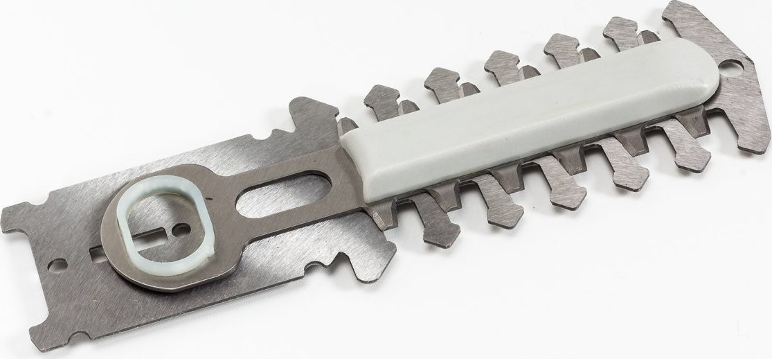 Prezentowane urządzenie jest wyposażone w wymiennie ostrza z wysokogatunkowej stali, ostrzone laserowo. Jedno ostrze o szerokości 70 mm służy do cięcia trawy, a drugie (dłuższe) o długości 100 mm do kształtowania niewielkich żywopłotów i krzewów, takich jak bukszpany. Zmiana ostrzy jest bardzo prosta i nie wymaga użycia narzędzi. Jeśli zależy Ci na szybkim cięciu niewielkiego żywopłotu, warto wybrać nożyczki NAC. Idealnie sprawdzają się przy formowaniu najbardziej wymyślnych kształtów krzewów. Wytrzymała listwa tnąca jest odporna na uszkodzenia i pozwala ciąć gałęzie o maksymalnej średnicy 8 mm.